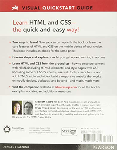 Need to learn HTML and CSS fast? This best-selling reference’s visual format and step-by-step, task-based instructions will have you up and running with HTML in no time. In this updated edition author Bruce Hyslop uses crystal-clear instructions and friendly prose to introduce you to all of today’s HTML and CSS essentials. The book has been refreshed to feature current web design best practices. You’ll learn how to design, structure, and format your website. You’ll learn about the new elements and form input types in HTML5. You’ll create and use images, links, styles, and forms; and you’ll add video, audio, and other multimedia to your site. You’ll learn how to add visual effects with CSS3. You’ll understand web standards and learn from code examples that reflect today’s best practices. Finally, you will test and debug your site, and publish it to the web. Throughout the book, the author covers all of HTML and offers essential coverage of HTML5 and CSS techniques.