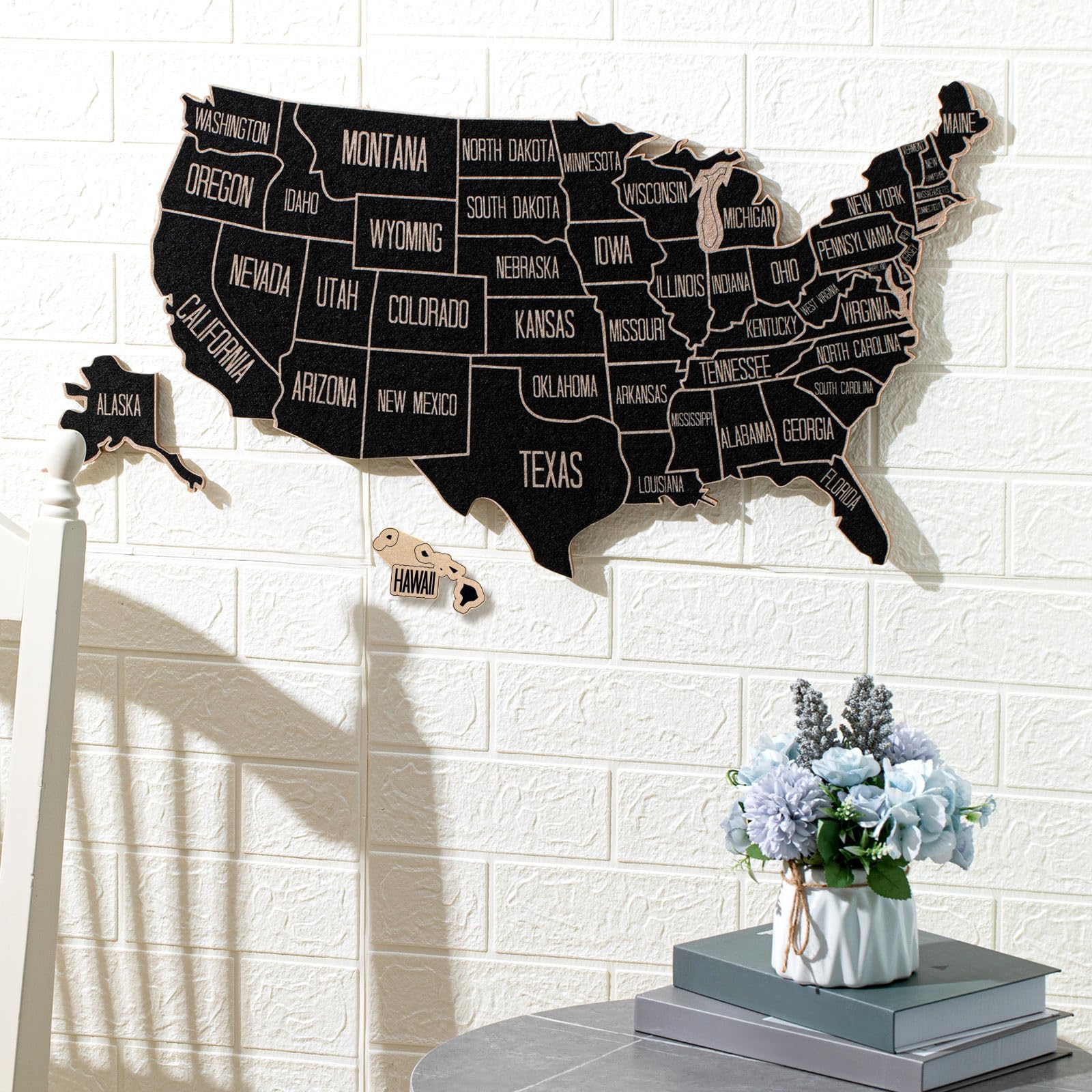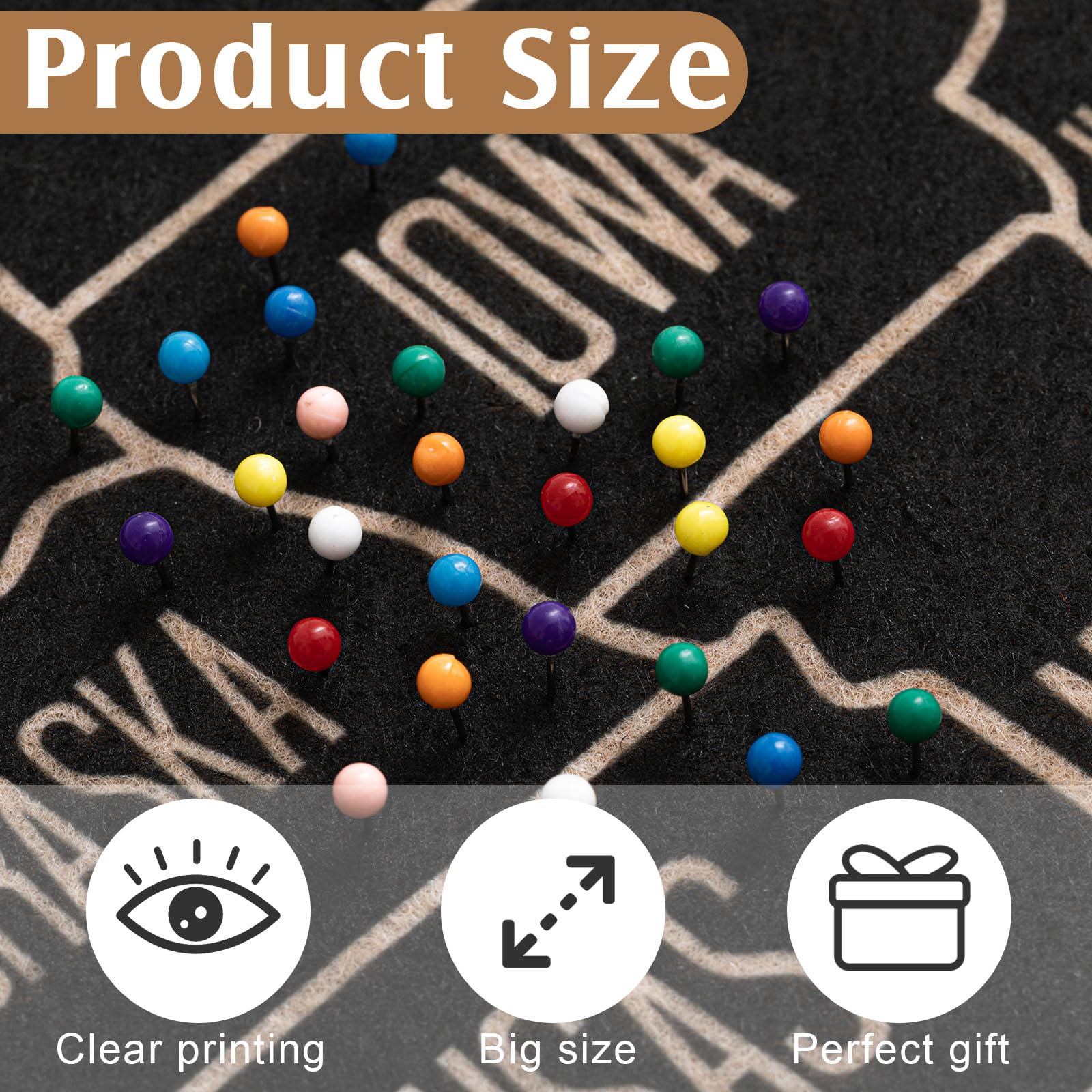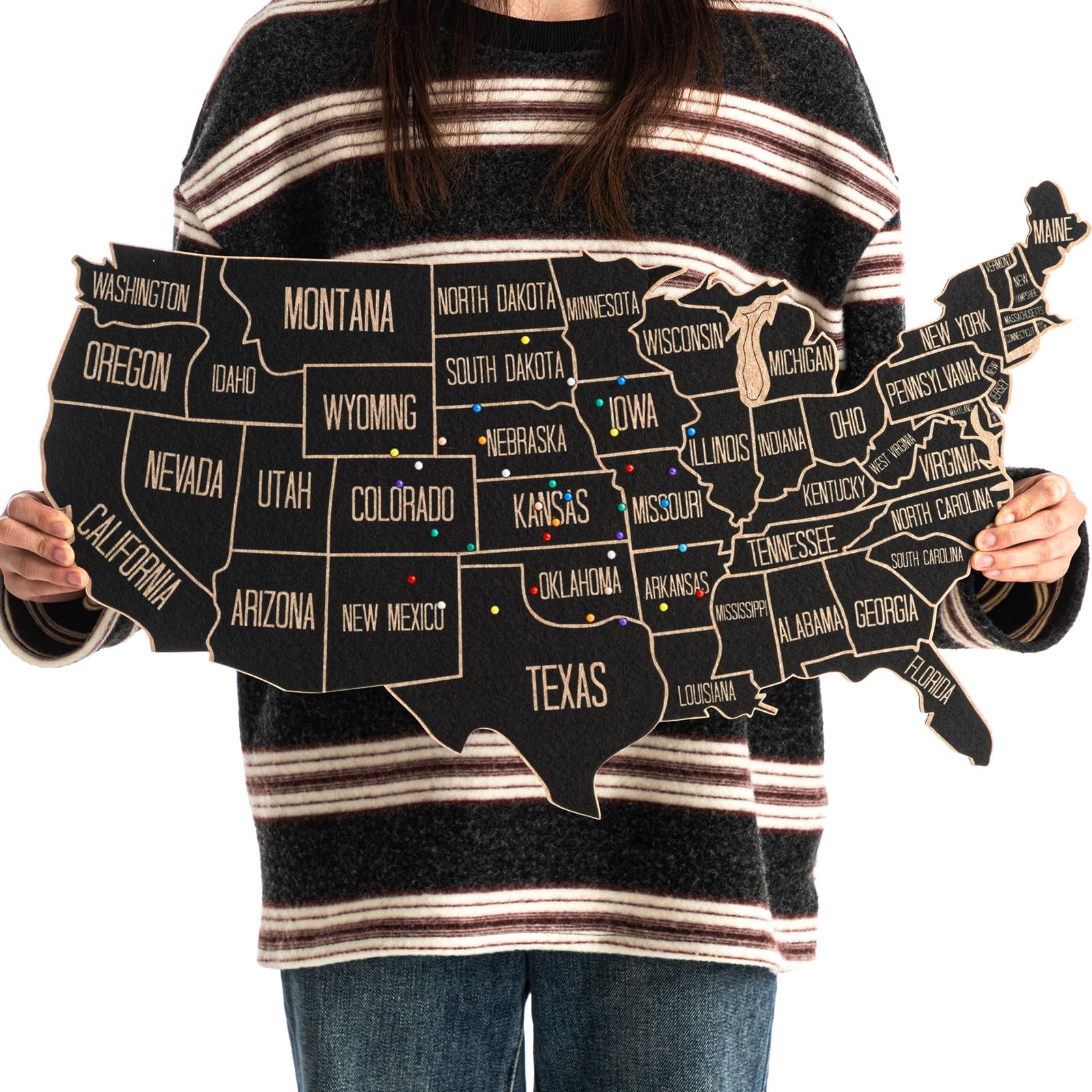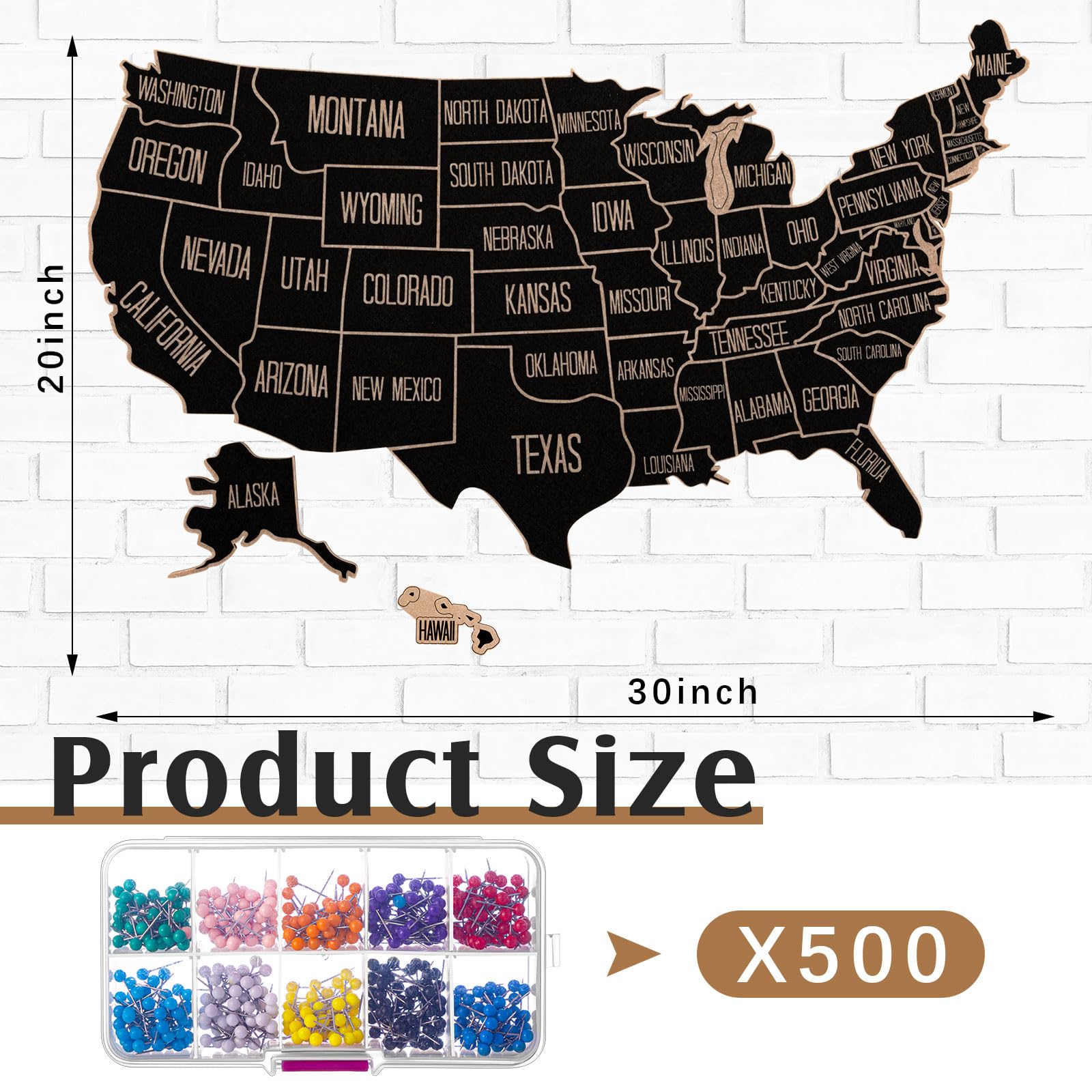 Features: The USA maps for wall are made of felt board, built to last, can accompany you for a long time. Specifications: Material of USA map: felt board Color: multicolor Size of USA map: about 30 x 20 inches Package includes: 1 x US travel map 500 x Push pins Notes: Manual measurement, please allow slight errors on size. The color may exist a slight difference due to different screen displays.