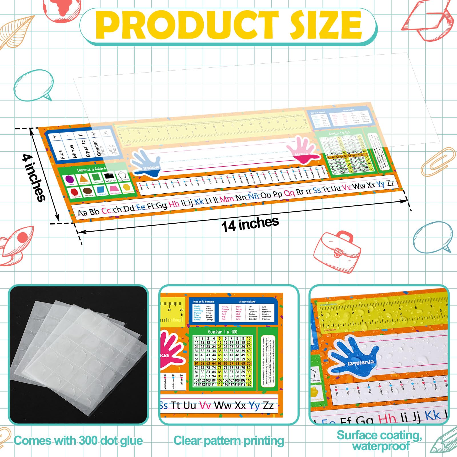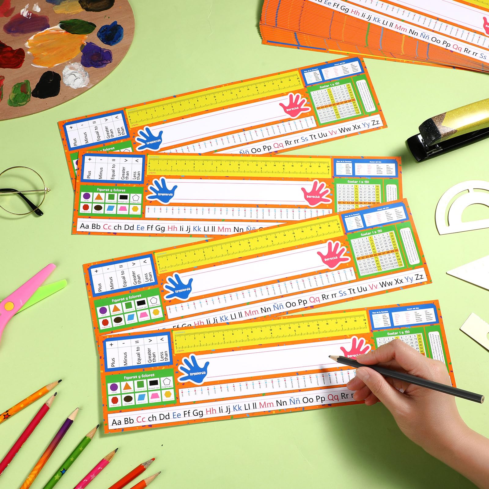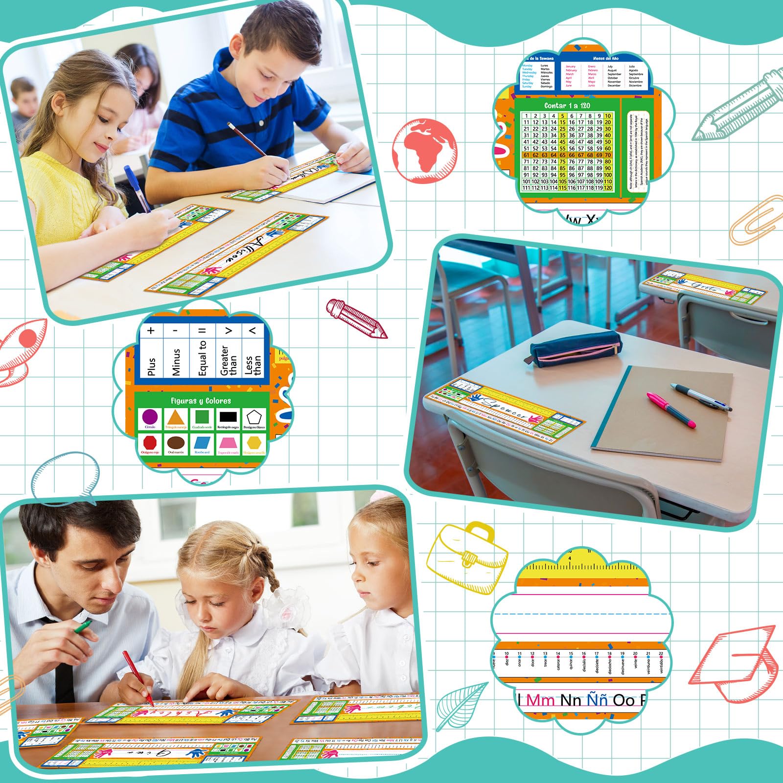 - Special Design: name tags for desks come with Spanish spellings for letters, months, days of the week, 10 shapes and more; Also includes dollars, rulers, counting spools, numbers 1 through 120, right and left hand icons, and notes to meet a variety of student learning needs