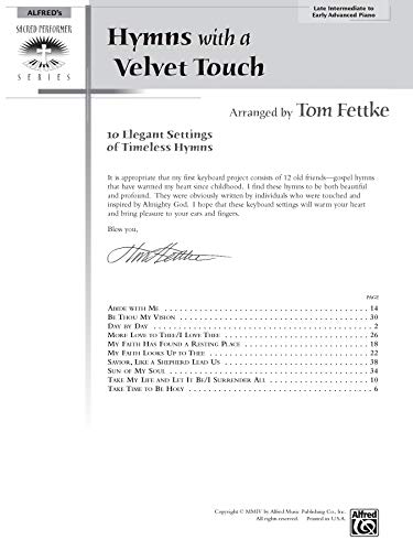 Tom Fettke brings to the keyboard his vast experience as an arranger. The lush arrangements included in this collection are refreshing settings of beautiful, timeless hymns. Titles: Abide with Me * Be Thou My Vision * Day by Day * More Love to Thee with I Love Thee * My Faith Has Found a Resting Place * My Faith Looks Up to Thee * Savior, Like a Shepher Lead Us * Sun of My Soul * Take My Life and Let It Be with I Surrender All * Take Time to Be Holy.