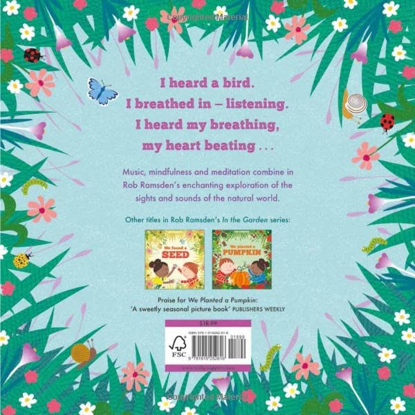 A little girl hears a bird, who is frightened away by some cats fighting. As she searches for her bird, she encounters many other intriguing animals and insects. Then, after sitting down to listen to and enjoy the sounds of nature all around, suddenly her bird comes back! This enchanting exploration of the sights and sounds of the natural world brings in themes of music, mindfulness, and meditation and will be appreciated by adults and children alike. The simple text uses poetry and repetition and will be a joy to re-read many times.