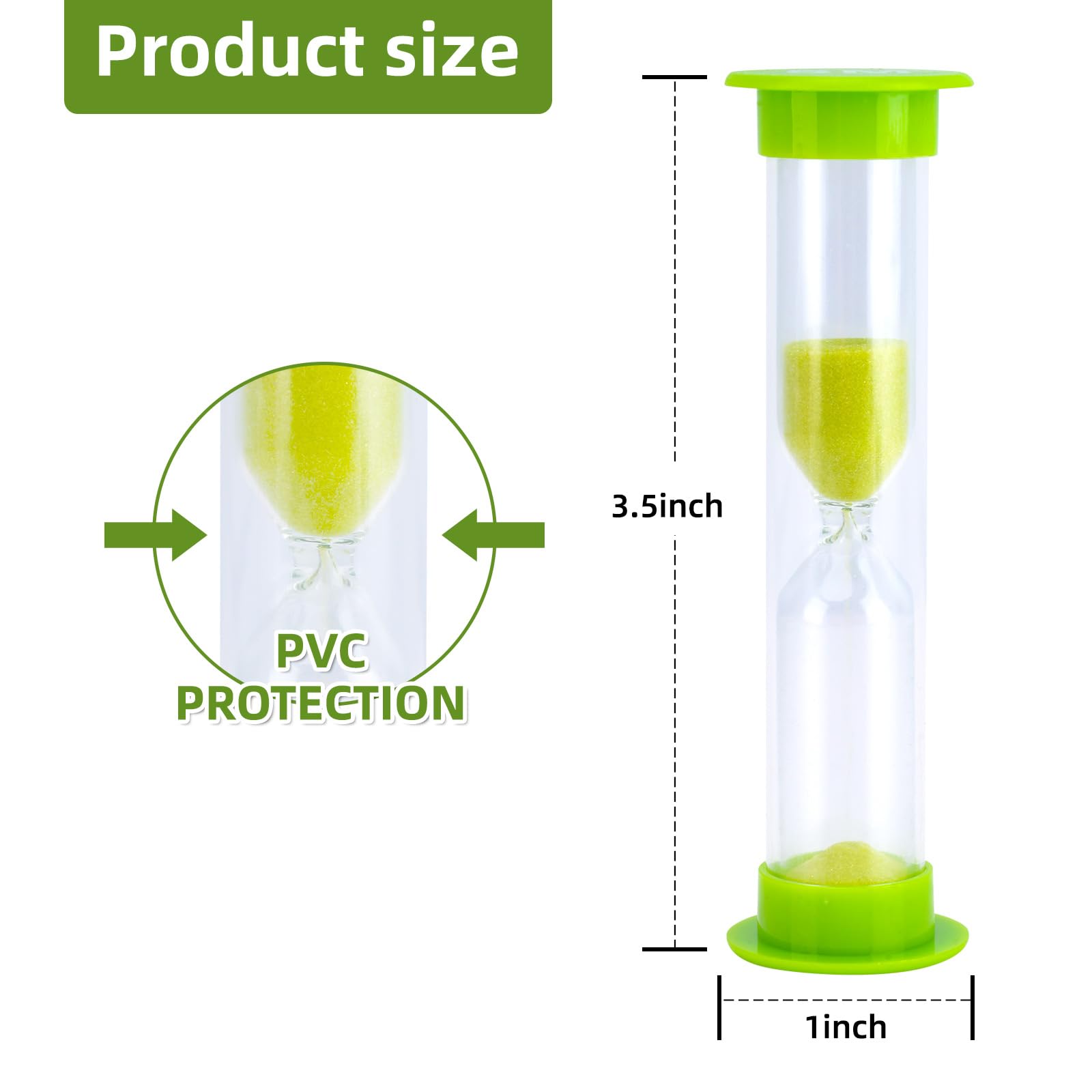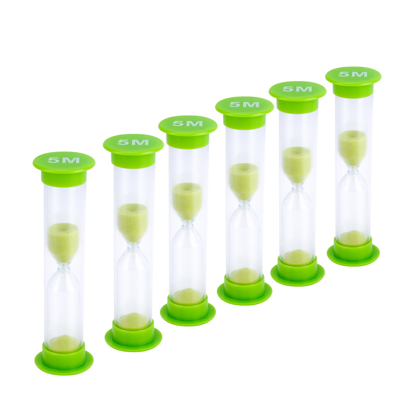 Manage your time effectively with our pack of 6 green 5-minute sand timers. These versatile hourglass timers are perfect for a range of tasks, including cooking, studying, playing games, or even meditating. Made from durable PVC, ABS plastic, and a clear glass tube, each timer measures approximately 3.5 x 1 inch, making them compact and portable for on-the-go use. 5 minute timer, sand timers for classroom. Whether you’re setting a time limit for classroom activities, timing study sessions, or keeping track of your yoga poses, these 5-minute timers are an ideal solution. The green sand adds a fun, visually appealing touch that makes these timers not only practical but also a decorative addition to your home or office. Each pack comes with six timers, providing ample options for multiple uses. While not a precision timing device, they offer an approximate 5-minute countdown with a 1-5% deviation, perfect for everyday non-precision tasks.