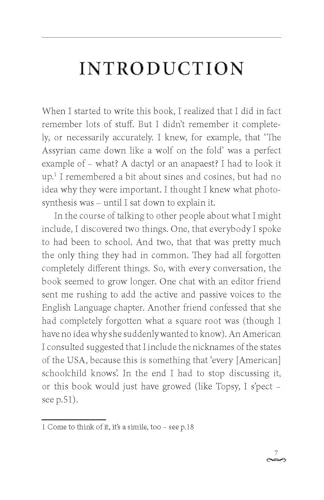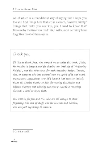 ‘This is a fascinating book … it will no doubt be a great source of entertainment around many a dinner table’ – She Magazine ______________________________ A Sunday Times top-ten title in 2008 and a bestseller ever since, I Used to Know That has continued to delight readers with its pages of forgotten facts from our school days. I Used to Know That is an ideal and accessible reference guide for adults wanting to brush up on their lost knowledge – or prepare for a pub quiz! If you’ve forgotten the capital city of Chile; the basics of osmosis; how to solve a quadratic equation; who wrote the famous poem about daffodils; the use of a conjunction or the number of continents in the world, I Used to Know That is guaranteed to provide all the answers.