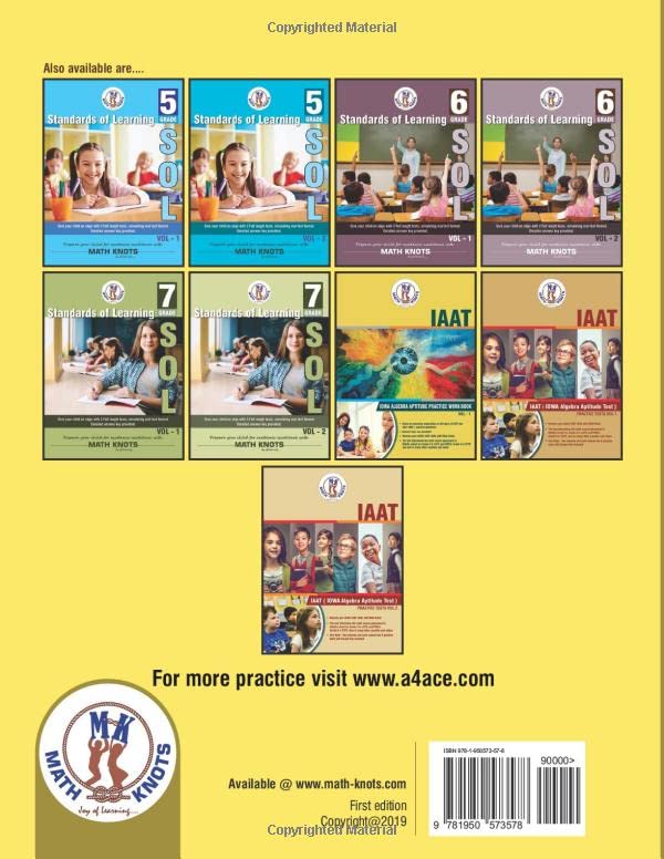 The IAAT (Iowa Algebra Aptitude) Test was developed to help teachers and counselors make informed decisions about the initial placement of students in the secondary mathematics curriculum. IAAT test provides a four-part profile of students that identifies specific areas of strengths and weaknesses. This test is a time-based test, for which speed and accuracy are important factors. Math-Knots IAAT Books, designed to harnesses a child’s IAAT skills. Math-Knots IAAT Work Book Includes: Topics covering Pre-algebra skills extensively 1000 + questions Answer key is included. The content has been successfully used by many kids over the years to ace the test. Also available IAAT(IOWA Algebra Aptitude) Work book – Vol 1 IAAT(IOWA Algebra Aptitude) Practice Tests – Vol 1 a4ace offers an online comprehensive test prep course for students IAAT prep. The most effective online test prep course for boosting your IAAT test score. Practice test series with 9 , 12 , 21 or 32 practice tests Various packages to choose Detailed step by step solutions Strategies to improve speed & accuracy on the test Students can practice as many times as they need Time based assessments simulating the real test. Many of our students got highest scores Visit https://a4ace.com Purchase ONLY our latest edition books. If you see any issues, please email us [email protected]. For more practice tests visit www.a4ace.com For concept based videos send us an email to [email protected] with a proof of purchase