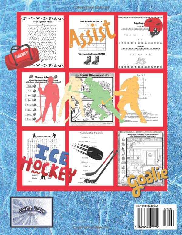 Do you know an ice hockey loving kid? It’s hard not to – girls and boys of all ages around the world are playing ice hockey all year long, both indoors and outdoors. Rinks, ponds and lakes are full of kids shooting pucks and there’s the smooth sound of sharp skate blades cutting through the ice and the loud sound of pucks hitting boards after school and all day long on weekends. Why not give the kids a book that features activities all about ice hockey? The puzzles, which are unique to this book, will keep them intrigued, challenged and occupied for quite a while. This fun activity book, with a subtle educational component, will also extend their knowledge about the coolest game in the world. There are plenty of age appropriate and hockey centric puzzles, games and activity pages that are challenging, entertaining and sometimes a bit quirky. Kids can just have fun doing puzzles that focus on a game they love. The book is perfect for both boys and girls and can be enjoyed independently or with a sibling or friend. Solutions for all puzzles are included. Inside the 8.5 x 11-inch book with a black and white interior you’ll find: * 9 Mazes * 19 Word Searches * 10 Cryptograms * 1 Crossword Puzzle * 4 Search and Find Hidden Image Puzzles * 6 Word Scrambles * 1 Sudoku * 6 Wordoku * 9 Palindromes * 4 Dot to Dot & Spot the Difference * 2 Rebus Puzzles * Would You Rather, Riddles, Coloring Pages, Tic Tac Toe and more Get one for a child or for the members of a team – create a challenge with kids competing to complete the puzzles. The book is also a terrific present, loot bag filler and a great rainy day activity. It can fill lots of time on those road trips to games and tournaments. Buy the book today – there’s always a game, practice, road trip or rainy day right around the corner.
