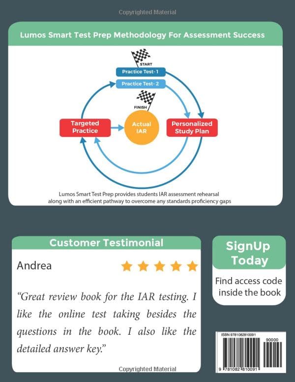 Give Your Child an Edge on the 2025 IAR! Prepare them to excel in the Illinois state assessments with confidence and ease Designed by IAR experts, the Lumos Learning 7th Grade English Language Arts Practice Workbook is crafted to boost your child’s test scores by 10-15 points. Featuring hundreds of practice questions fully aligned with Illinois’s I.L.S standards, realistic online practice tests, and personalized learning paths, this workbook is tailored to your child’s needs What’s New in the 2024-25 Lumos IAR Grade 7 ELA Workbook? Introducing Lumos AI Tutor: While completing practice tasks, your child receives personalized, guided support with step-by-step explanations, helpful hints, and tailored feedback–just like having a teacher at home! Try it today with your workbook. Comprehensive IAR Prep with 7th Grade ELA Practice Questions Expert-Designed Practice: Hundreds of carefully crafted questions aligned with the IAR test, available in both print and digital formats, covering every essential ELA concept. Comprehensive Coverage: The workbook addresses 40+ ELA skills, including Reading Literature, Reading Informational Text and Language. Realistic Practice Tests: Prepare your child with two full-length practice tests that mirror the exact format and difficulty level of the IAR exam, helping them feel confident and ready for test day. Personalized Study Plan: Based on your child’s performance in the online practice tests, receive a personalized study plan to guide them through targeted remedial practice using the physical workbook. Lumos AI Tutor: Acting as a personal coach, the AI Tutor provides step-by-step guidance, hints, and real-time feedback to keep your child on track and engaged during practice. Progress Tracking: Compare your child’s progress with their peers using easy-to-read performance reports, allowing you to address any learning gaps early. Exclusive Print & Digital Resources What’s Included in the Printed Workbook? Three chapters covering all Illinois ELA standards Answer keys with detailed explanations Exclusive Online Resources Two full-length practice tests mirroring the 2025 IAR exam Personalized study plans for targeted remedial practice Engaging test prep resources such as guided practice questions, solved examples, videos, mind maps, flashcubes, and more A user-friendly dashboard with detailed performance reports Lumos AI Tutor for personalized support during practice Why Parents Trust Lumos tedBook for Illinois State Tests With over 17 years of experience, Lumos Learning has helped more than 1.3 million students, 164,600 teachers, and 58,100 schools improve their test outcomes. Our Smart Test Prep Methodology ensures your child is fully prepared for the 2025 IAR. A Workbook Designed for Year-Round Learning Whether for classroom instruction, at-home practice, homeschooling, or tutoring, the Lumos IAR ELA Workbook provides an engaging and effective way to prepare for the Illinois state tests. Don’t wait–give your child the advantage they need for the 2025 IAR with the Lumos tedBook. Order today and start preparing for success!
