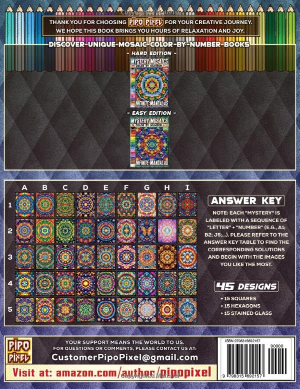 Discover the Challenge and Beauty of Infinite Mandalas – Hard Edition – Mystery Mosaic Color by Number – Vol. 01 Why You’ll Love This Book: 45 Unique Designs – Enjoy a variety of mosaic-style mandalas in Square, Hexagon, and Stained Glass styles, each offering a mesmerizing and immersive coloring experience. Consistent 30-Color Palette – All pages follow a single, easy-to-reference 30-color palette, conveniently numbered and printed on the first interior page for quick access. Answer Key Included – See the finished versions of all designs on the back cover to guide and inspire your coloring journey. Clear Numbering System – All areas to be colored are clearly numbered. White spaces remain unnumbered, preserving intricate details and design flow. Please Note: Small Numbering – The numbers used are about 3.3mm in size, allowing for complex and stunning results. This may require more focus, especially for those with limited vision. If you prefer a simpler option, check out our “Easy Edition” of the same theme. Paper Thickness – Some minor bleed-through may occur depending on your coloring tools. To help protect your artwork, we’ve included 5 bonus blank sheets you can use as blotting pages. About This Book: This Hard Edition of Infinite Mandalas is designed for advanced colorists who love mystery mosaics with a touch of complexity. Each page is a puzzle waiting to be revealed as you fill in the colors one by one. A Gift of Calm and Creativity: Perfect for adults, teens, or anyone looking for a relaxing yet mentally stimulating activity. Whether it’s for a birthday, holiday, or just because, this book makes a thoughtful gift for art and puzzle lovers. Encouragement and Tips: Take your time, enjoy the rhythm of coloring, and don’t worry about perfection–the joy is in the journey. Use colored pencils or fine-tip markers for best results, and remember to place the extra sheet behind the page you’re working on. Let each mandala surprise and inspire you as the design slowly unfolds!