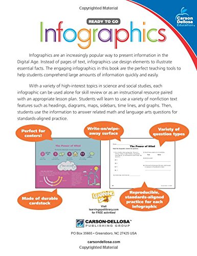 Present facts in a visually engaging, cross-curricular learning format to help students quickly and easily comprehend information. Infographics for grade 1 provides language arts- and math-based questions related to social studies and science topics such as the seasons, ancient Egypt, and more. Infographics for grade 1 offers a time-saving, cross-curricular solution that supports 21st century learning. Filled with full-color visuals, Infographics for grade 1 illustrates essential facts and appeals to learners. The engaging infographics in this book help students successfully comprehend a large amount of data and answer corresponding questions. With a variety of high-interest science and social studies topics, these infographics are perfect to use individually for skill review or as an instructional resource. Students will learn to use a variety of nonfiction text features such as headings, diagrams, maps, sidebars, time lines, graphs, and more. The Ready to Go: Infographics series for kindergarten to grade 5 combines math, language arts, science, and social studies into one convenient resource. Students will study infographics on a variety of science and social studies topics and use them to answer related math and language arts questions. The high-interest topics and full-color visuals keep students engaged in practicing valuable skills, from computation to using text features. This all-in-one series supports academic growth through concept application and enhanced critical thinking skills.