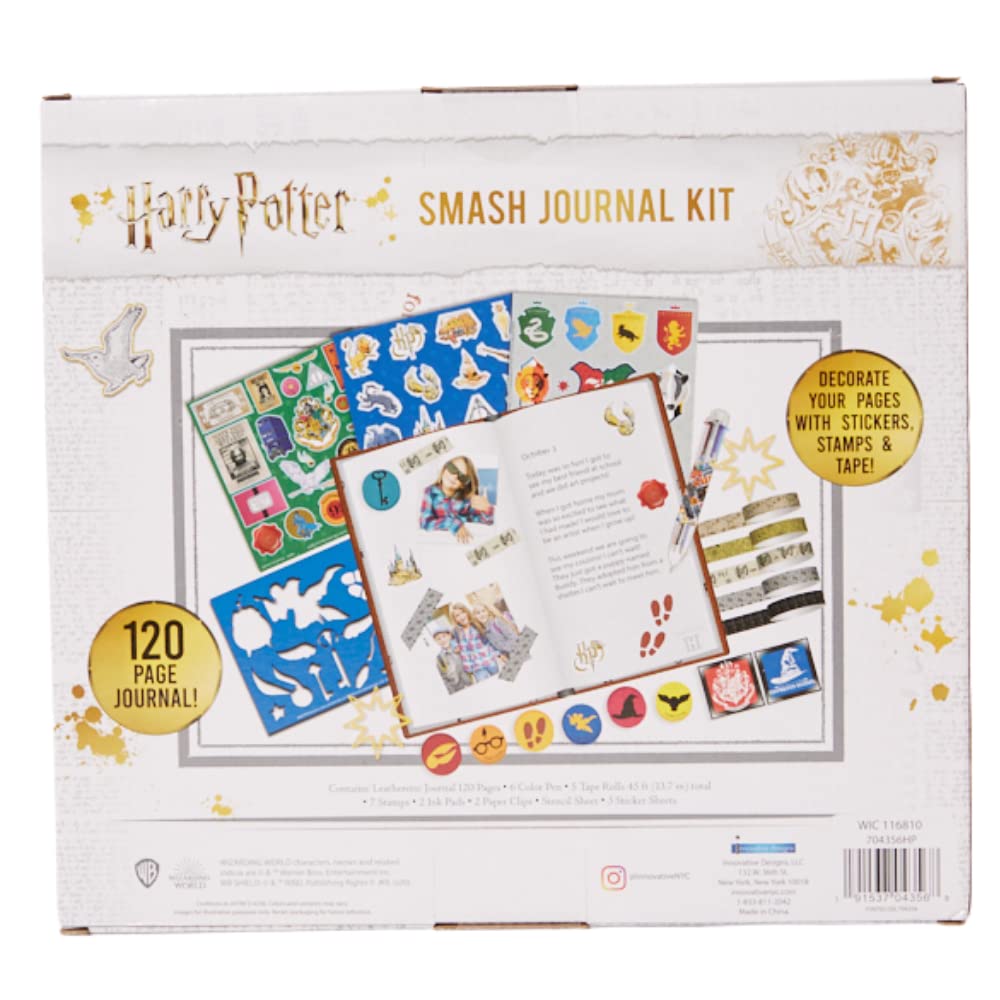 - KIDS SMASH JOURNAL – The soft leatherette journal has lined pages with a Hogwarts watermark in the corners. The vintage looking cover has an attached tie and a Hogwarts emblem. Decorate the pages with the included stickers, stencils, stamps, and tape!