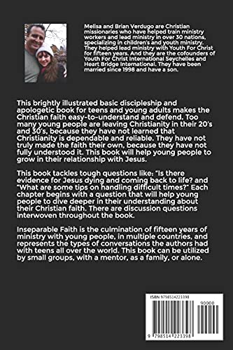 Too many young people are leaving Christianity in their 20s and 30s because they haven’t truly made the faith their own nor fully understood it. This brightly illustrated basic discipleship and apologetic book for teens and young adults make the Christian faith easy to understand and defend. This book helps young people to grow in their relationship with Jesus and to defend their faith. Inseparable Faith tackles tough questions like: “Is there evidence for Jesus dying and coming back to life? and “What are some tips on handling difficult times?” Each chapter begins with a question that will help young people dive deeper into their understanding of their Christian faith. There are discussion questions interwoven throughout the book. Inseparable Faith is the culmination of fifteen years of ministry with young people in multiple countries and represents the types of conversations the authors had with teens worldwide. This book can be utilized by individuals, and families, with a mentor, as a Bible Study, in youth groups, or a new believers’ class. It is divided into three parts: The Basic Beliefs of Christianity, Defending the Faith, and Discipleship Plan and Tracker. In the section The Basic Beliefs of Christianity, the reader is given a simple explanation of each essential biblical belief/doctrine and the scriptural backing, in an easy-to-understand conversational tone, along with the questions to consider. In the section Defending the Faith, the reader is presented with facts supporting the most often attacked beliefs. This section increases the young person’s understanding of the facts that support their faith, better preparing them to defend their faith and giving them a more solid footing in their faith. The Discipleship Plan and Tracker provides a simple discipleship plan with action steps and a tracker for those utilizing Inseparable Faith to disciple a young person or group. The questions throughout the chapters allow the young person to reflect on their understanding, discuss it, and apply it to their lives, where applicable. For groups or with a mentor, you can either read the chapter together and then discuss the questions that are peppered throughout, or if you are short on time, read the chapter ahead of time and then discuss the questions together. Get this book for new believers or the young person in your life who wants to grow in their understanding of their faith and their relationship with Jesus. Perfect for Gen Z.