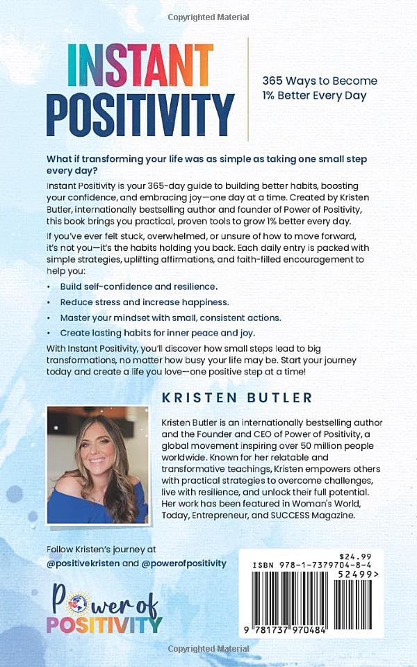 Feeling Stuck, Anxious, or Overwhelmed? Imagine waking up tomorrow feeling just 1% better–then doing it again the next day. How different would your life look a year from now? The truth is, it’s not a lack of desire holding you back–it’s your daily habits. But here’s the good news: Change doesn’t have to be overwhelming. It starts small. Introducing Instant Positivity: 365 Ways to Become 1% Better Every Day, by international bestselling author Kristen Butler–founder of Power of Positivity(r), a global community inspiring over 60+ million people worldwide. Can You Really Transform Your Life in Just Minutes a Day? Absolutely! This daily guide provides simple yet effective tools scientifically designed to: Effortlessly shift your mindset from anxiety to calm. Build resilience and inner strength–without stress or struggle. Enjoy daily actionable positivity–making meaningful progress every single day. Experience gentle, supportive guidance–helping you move beyond overwhelm to lasting inner peace. Why Thousands Worldwide Choose Instant Positivity: Quick Daily Inspiration: Entries take just minutes to read, perfectly fitting into your busy schedule. Science-Backed Strategies: Proven methods from cutting-edge research in positive psychology and habit formation. Real-Life, Relatable Insights: Kristen’s authentic voice feels like a comforting conversation with a trusted friend (seriously!) Immediate Application: Clear, powerful actions to instantly implement positive changes. Who Is This Book For? If you’ve ever thought, “I just don’t know where to start…” If anxiety and overwhelm often hold you back from your true potential… If you’re craving more joy, confidence, and purpose–but feel stuck… Instant Positivity is your roadmap to meaningful change. Ready to Feel Better, Starting Today? You deserve happiness, calm, and meaningful progress. Don’t stay trapped in anxiety another day. Order Instant Positivity Now and start your 365-day journey toward your best self. Gift a copy and gain an accountability partner to inspire each other all year! About the Author Kristen Butler is an internationally bestselling author and Founder & CEO of Power of Positivity(r), inspiring over 50 million followers worldwide. Featured in Woman’s World, TODAY, Entrepreneur, and SUCCESS Magazine, Kristen helps millions unlock their potential through positivity, faith, resilience, and practical self-care strategies. “Positivity starts with daily choices that align with who you want to become.”– Kristen Butler