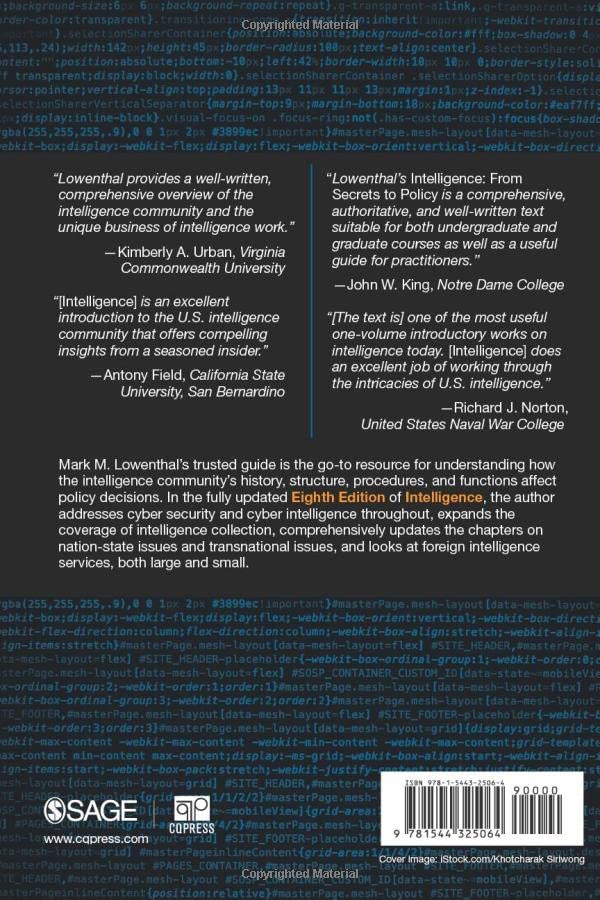 Mark M. Lowenthal’s trusted guide is the go-to resource for understanding how the intelligence community’s history, structure, procedures, and functions affect policy decisions. In the fully updated Eighth Edition of Intelligence, the author addresses cyber security and cyber intelligence throughout, expands the coverage of collection, comprehensively updates the chapters on nation-state issues and transnational issues, and looks at foreign intelligence services, both large and small.