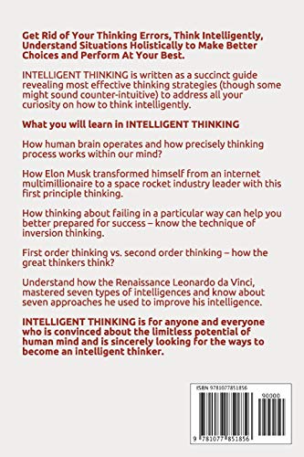 Get Rid of Thinking Errors, Think Intelligently, Develop Mind to Understand Situations Holistically, Make Better Decisions and Start Getting Things Done Faster! Do you find yourself trapped in older pre-conditioned thinking patterns and miss out on new opportunities? Do you wonder why despite good intentions you often struggle to solve problems? Do you often delay in decision-making? How would your life change if you can independently observe and learn the art of thinking clearly? What if you could learn the most effective techniques followed by great thinkers like Leonardo da Vinci, Einstein, and business legends like Elon Musk, Warren Buffett. Imagine having access to a fully loaded toolbox with sharpest thinking tool you could use to analyze every situation holistically? Imagine your confidence boosting up if you not only are aware non-serving thinking patterns but also master the effective thinking techniques followed by the high performers and getting things done faster. Som Bathla, an avid reader, researcher and an Amazon best-selling author of multiple books reveals the answers to above and much more in his book INTELLIGENT THINKING. INTELLIGENT THINKING is written as a succinct guide revealing most effective thinking strategies (though some might sound counter-intuitive) to address all your curiosity on how to think intelligently. Here is what you will learn in INTELLIGENT THINKING How human brain operates and how precisely thinking process works within our mind? How Elon Musk transformed himself from an internet multimillionaire to a space rocket industry leader with this first principle thinking. How your thinking abilities are not dependent on your IQ and what matters most as per Warren Buffett. Different types of thinking people follow (check where do you find yourself) Most common cognitive biases that trip you up for making irrational, illogical decisions and triggered by your emotions. Understand the power of neuroplasticity that allows you to change the way you think. Beware of your thinking patterns marketers misuse to sell you more of what you never wanted. How thinking about failing in a particular way can help you better prepared for success – know the technique of inversion thinking. First order thinking vs. second order thinking – how thinkers do a deep work in thinking. How integrative thinking can create a whole blue ocean of possibilities. Learn how this type of thinking invented ‘shopping cart’ and how rolling suitcases got invented out of a particular type of thinking. Understand how to think like Leonardo da Vinci by knowing about seven approaches he used to improve his intelligence. And much much more…. Albert Einstein once rightly said: “The world we have created is a product of our thinking; it cannot be changed without changing our thinking.” INTELLIGENT THINKING is for anyone and everyone who is convinced about the limitless potential of human mind and is sincerely looking for the ways to become an intelligent thinker. Are you ready? Take Your First Step Toward Intelligent Thinking, Unleash Your Mind’s Full Potential, and Become Your Own Best Version!