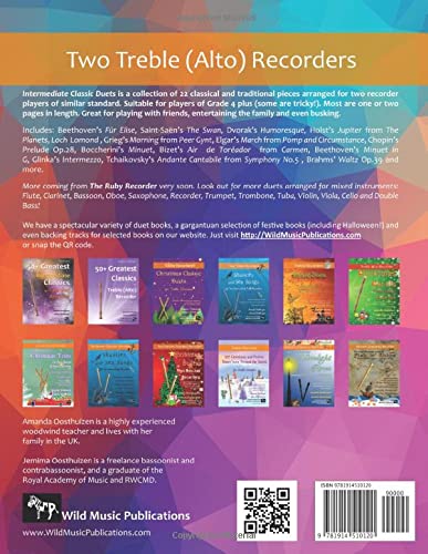 Intermediate Classic Duets for Treble (Alto) Recorders is a collection of 22 classical and traditional pieces arranged for advancing players of a similar standard. Although a few are easier, most explore the full range of notes and would suit players of around Grades 4+ (some are quite tricky!). The melody moves between parts – more difficult but great for listening to each other, and fun. Perfect for playing in lessons, with friends, and even for entertaining the family. Most are in easy keys and are one page, several are two or three pages. We have included both classical and traditional tunes, slow and fast pieces, easy and difficult, ones to play straight away and others to work on. Includes extracts from: Beethoven’s Fur Elise, Saint-Saens’ The Swan; Dvorak’s Humoresque, Holst’s Jupiter, Loch Lomond, Grieg’s Morning from Peer Gynt, Elgar’s March from Pomp and Circumstance, Chopin’s Prelude Op.28, Boccherini’s Minuet, Bizet’s Air de Toreador, Beethoven’s Minuet in G, Glinka’s Intermezzo, Tchaikovsky’s Andante Cantabile from Symphony No.5 , Brahms’ Waltz and more, some of which we expect you’re unlikely to know because we wanted to include an element of musical exploration and adventure. Have fun! More coming from The Ruby Recordervery soon. Look out for our solo, duet and trio music arranged for different playing levels and for mixed instruments: Flute, Clarinet, Bassoon, Oboe, Saxophone, Recorder, Trumpet, Trombone, Tuba, French Horn, Violin, Viola, Cello and Double Bass, Mini-bassoon, Tenoroon, Guitar etc. We have a spectacular variety of duet books, a gargantuan selection of festive books (including Christmas, Valentine’s and Halloween!), theory puzzle books for very young recorder players and even a few downloadable playalong and backing tracks and sheet music on our website. Just visit WildMusicPublications.com and for news of our latest books, why not follow us on Twitter? @wmpublications