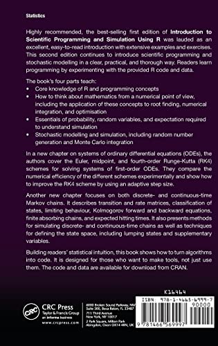Learn How to Program Stochastic Models Highly recommended, the best-selling first edition of Introduction to Scientific Programming and Simulation Using R was lauded as an excellent, easy-to-read introduction with extensive examples and exercises. This second edition continues to introduce scientific programming and stochastic modelling in a clear, practical, and thorough way. Readers learn programming by experimenting with the provided R code and data. The book’s four parts teach: Core knowledge of R and programming concepts How to think about mathematics from a numerical point of view, including the application of these concepts to root finding, numerical integration, and optimisation Essentials of probability, random variables, and expectation required to understand simulation Stochastic modelling and simulation, including random number generation and Monte Carlo integration In a new chapter on systems of ordinary differential equations (ODEs), the authors cover the Euler, midpoint, and fourth-order Runge-Kutta (RK4) schemes for solving systems of first-order ODEs. They compare the numerical efficiency of the different schemes experimentally and show how to improve the RK4 scheme by using an adaptive step size. Another new chapter focuses on both discrete- and continuous-time Markov chains. It describes transition and rate matrices, classification of states, limiting behaviour, Kolmogorov forward and backward equations, finite absorbing chains, and expected hitting times. It also presents methods for simulating discrete- and continuous-time chains as well as techniques for defining the state space, including lumping states and supplementary variables. Building readers’ statistical intuition, Introduction to Scientific Programming and Simulation Using R, Second Edition shows how to turn algorithms into code. It is designed for those who want to make tools, not just use them. The code and data are available for download from CRAN.