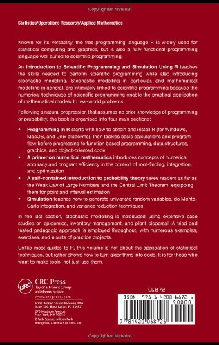 Known for its versatility, the free programming language R is widely used for statistical computing and graphics, but is also a fully functional programming language well suited to scientific programming. An Introduction to Scientific Programming and Simulation Using R teaches the skills needed to perform scientific programming while also introducing stochastic modelling. Stochastic modelling in particular, and mathematical modelling in general, are intimately linked to scientific programming because the numerical techniques of scientific programming enable the practical application of mathematical models to real-world problems. Following a natural progression that assumes no prior knowledge of programming or probability, the book is organised into four main sections: Programming In R starts with how to obtain and install R (for Windows, MacOS, and Unix platforms), then tackles basic calculations and program flow, before progressing to function based programming, data structures, graphics, and object-oriented code A Primer on Numerical Mathematics introduces concepts of numerical accuracy and program efficiency in the context of root-finding, integration, and optimization A Self-contained Introduction to Probability Theory takes readers as far as the Weak Law of Large Numbers and the Central Limit Theorem, equipping them for point and interval estimation Simulation teaches how to generate univariate random variables, do Monte-Carlo integration, and variance reduction techniques In the last section, stochastic modelling is introduced using extensive case studies on epidemics, inventory management, and plant dispersal. A tried and tested pedagogic approach is employed throughout, with numerous examples, exercises, and a suite of practice projects. Unlike most guides to R, this volume is not about the application of statistical techniques, but rather shows how to turn algorithms into code. It is for those who want to make tools, not just use them.