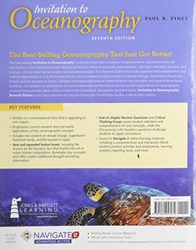 Each new print copy includes Navigate 2 Advantage Access that unlocks a comprehensive and interactive eBook, student practice activities and assessments, a full suite of instructor resources, and learning analytics reporting tools. The bestselling Invitation to Oceanography continues to provide a modern, comprehensive, and student-friendly introduction to this fascinating field. Spanning the four major divisions of ocean science–geology, chemistry, physics, and biology– it is an ideal text for majors and nonmajors alike. The Seventh Edition has been updated with sophisticated and cutting-edge graphics and photos throughout, and includes trending content on climate change, Superstorm/Hurricane Sandy, and the tsunami in Japan. Updated and expanded feature boxes reinforce key concepts and support knowledge building, and additional information on current research and the clinical and practical applications of oceanography contextualize scientific ideas within a real-world framework. Accessible yet substantive, Invitation to Oceanography, Seventh Edition is the ideal resource for anyone diving into the thrilling depths of the world’s oceans. With Navigate 2, technology and content combine to expand the reach of your classroom. Whether you teach an online, hybrid, or traditional classroom-based course, Navigate 2 delivers unbeatable value. Experience Navigate 2 today at www.jblnavigate.com/2