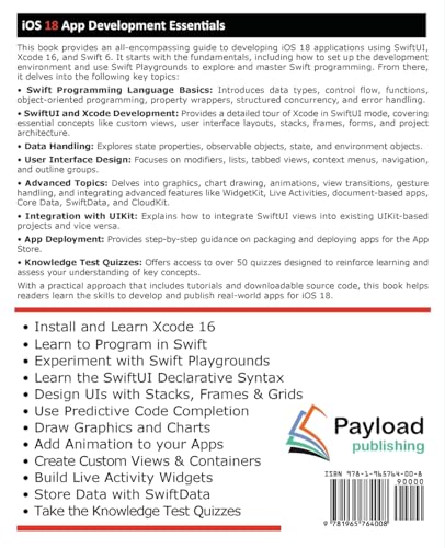 This book aims to teach the skills necessary to build iOS 18 applications using SwiftUI, Xcode 16, and the Swift programming language and includes access to over 50 online knowledge tests. Beginning with the basics, this book outlines the steps to set up an iOS development environment, together with an introduction to using Swift Playgrounds to learn and experiment with Swift. The book also includes in-depth chapters introducing the Swift programming language, including data types, control flow, functions, object-oriented programming, property wrappers, structured concurrency, and error handling. A guided tour of Xcode in SwiftUI development mode follows an introduction to the key concepts of SwiftUI and project architecture. The book also covers creating custom SwiftUI views and explains how these views are combined to create user interface layouts, including stacks, frames, and forms. Other topics covered include data handling using state properties and observable, state, and environment objects, as are key user interface design concepts such as modifiers, lists, tabbed views, context menus, user interface navigation, and outline groups. The book also includes chapters covering graphics and chart drawing, user interface animation, view transitions and gesture handling, WidgetKit, Live Activities, document-based apps, Core Data, SwiftData, and CloudKit. Chapters also explain how to integrate SwiftUI views into existing UIKit-based projects and integrate UIKit code into SwiftUI. Finally, the book explains how to package up a completed app and upload it to the App Store for publication. Along the way, the topics covered in the book are put into practice through detailed tutorials, the source code for which is also available for download. The aim of this book, therefore, is to teach you the skills to build your own apps for iOS 18 using SwiftUI. Assuming you are ready to download the iOS 18 SDK and Xcode 16 and have an Apple Mac system, you are ready to get started.