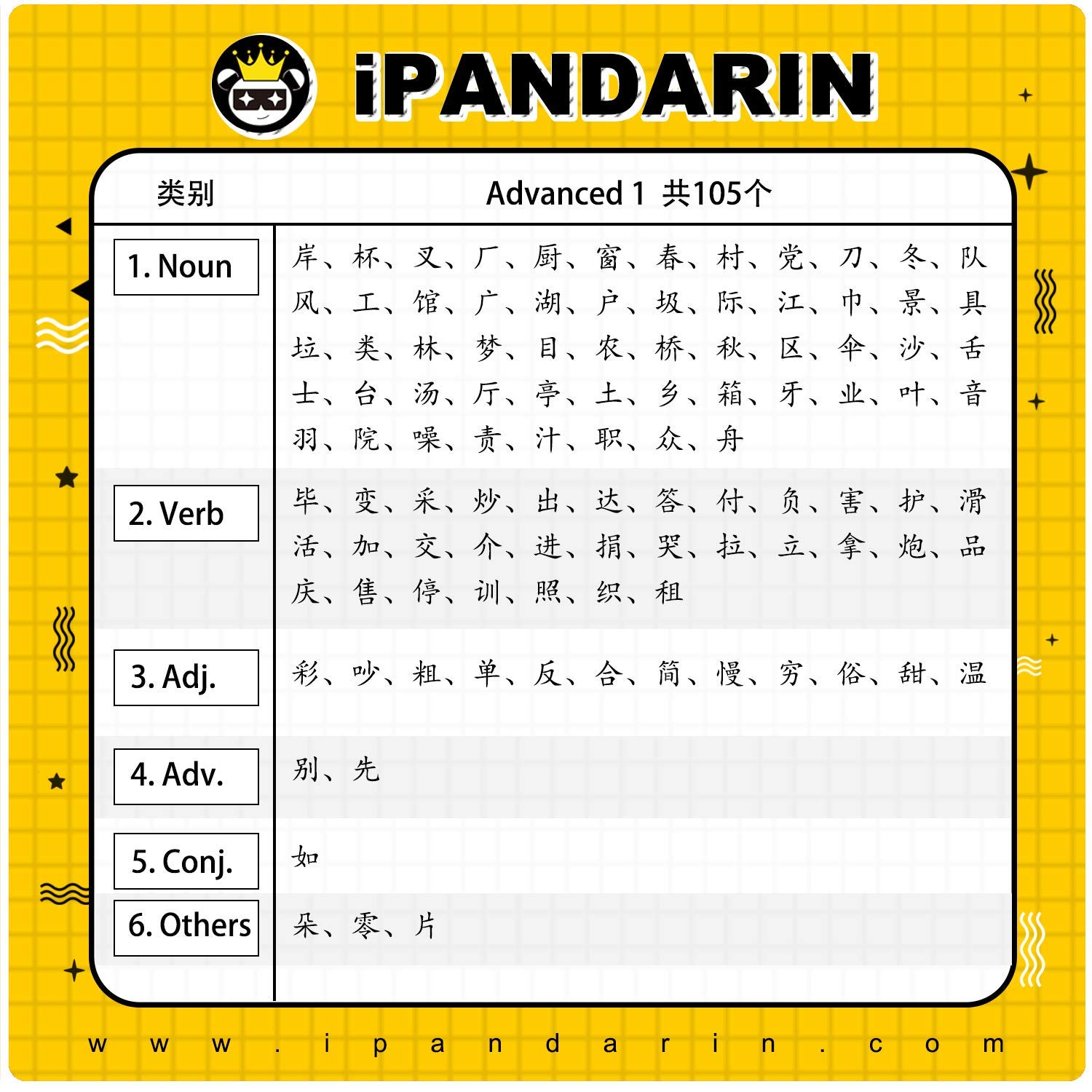iPandarin Innovation Chinese Character Flashcards Cards – Advanced 1 / HSK 3-4 – 105 Cards (With Audio Online) 6 boxes = 620 Character cards = 2000+ Vocabularies. Each box contains around 100 cards, a card frame, a list of characters and an instruction sheet. On each card, besides the character itself, its PinYin, and English meaning, there is also a uniquely designed Character painting to help remembering. Visual neurology studies show that visual memorization is one of the most effective ways of remembering. It is a critical factor in reading and writing. iPandarin is the only company in the world who can picture even complex Chinese characters. Why Us cover not only nouns but also verbs, adjectives, etc. 600 cards can form 2000+ words and different sentences. More information please go to www.ipandarin.com.