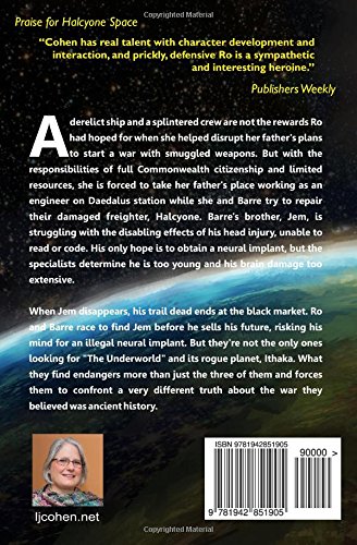 A derelict ship and a splintered crew are not the rewards Ro had hoped for when she helped disrupt her father’s plans to start a war with smuggled weapons. But with the responsibilities of full Commonwealth citizenship and limited resources, she is forced to take her father’s place working as an engineer on Daedalus station while she and Barre try to repair their damaged freighter, Halcyone. Barre’s brother, Jem, is struggling with the disabling effects of his head injury, unable to read or code. His only hope is to obtain a neural implant, but the specialists determine he is too young and his brain damage too extensive. When Jem disappears, his trail dead ends at the black market. Ro and Barre race to find Jem before he sells his future, risking his mind for an illegal neural implant. But they’re not the only ones looking for “The Underworld” and its rogue planet, Ithaka. What they find endangers more than just the three of them and forces them to confront a very different truth about the war they believed was ancient history.