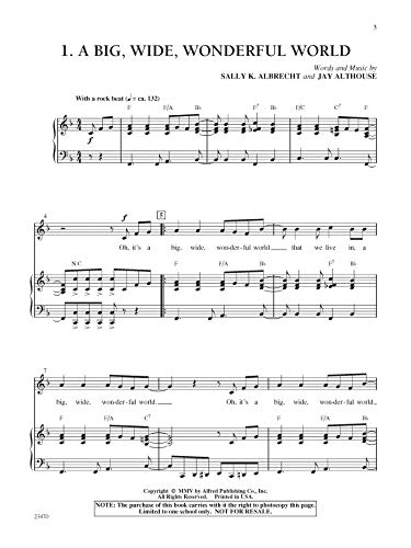 These 25 unison songs are a perfect way for young singers to explore many exciting countries from around the world, plus develop a love of multicultural musical styles. From Austria to Zimbabwe, your students will cherish these singable songs. Perform the full collection as a 40-minute program, or choose your favorites to sing in class. It’s 100% reproducible and 100% fun! It’s a Wonderful World!