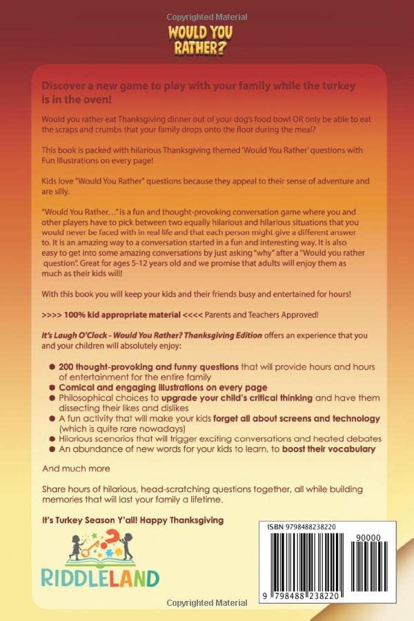 Discover a new game to play with your family while the turkey is in the oven! Would you rather wear just a tablecloth to Thanksgiving dinner with your family OR a fancy outfit that is two sizes too tight? Would you rather eat Thanksgiving dinner out of your dog’s food bowl OR only be able to eat the scraps and crumbs that your family drops onto the floor during the meal? This book is packed with hilarious Thanksgiving themed ‘Would You Rather’ questions with Fun Illustrations on every page! Click “look inside” on the cover to check out the illustrations Kids love “Would You Rather” questions because they appeal to their sense of adventure and are silly. “Would You Rather…” is a fun and thought-provoking conversation game where you and other players have to pick between two equally hilarious and hilarious situations that you would never be faced with in real life and that each person might give a different answer to. It is an amazing way to a conversation started in a fun and interesting way. It is also easy to get into some amazing conversations by just asking “why” after a “Would you rather question”. Great for ages 5-12 years old and we promise that adults will enjoy them as much as their kids will! With this book you will keep your kids and their friends busy and entertained for hours! 100% kid appropriate material – Parents and Teachers Approved! It’s Laugh O’Clock – Would You Rather? Thanksgiving Edition offers an experience that you and your children will absolutely enjoy: 200 thought-provoking and funny questions that will provide hours and hours of entertainment for the entire family Comical and engaging illustrations on every page Philosophical choices to upgrade your child’s critical thinking and have them dissecting their likes and dislikes A fun activity that will make your kids forget all about screens and technology (which is quite rare nowadays) Hilarious scenarios that will trigger exciting conversations and heated debates An abundance of new words for your kids to learn, to boost their vocabulary Straightforward instructions for a competitive version of the game to amp up the thrill level And much more Share hours of hilarious, head-scratching questions together, all while building memories that will last your family a lifetime. If you want your kids to start a new Thanksgiving tradition, then get the book now!