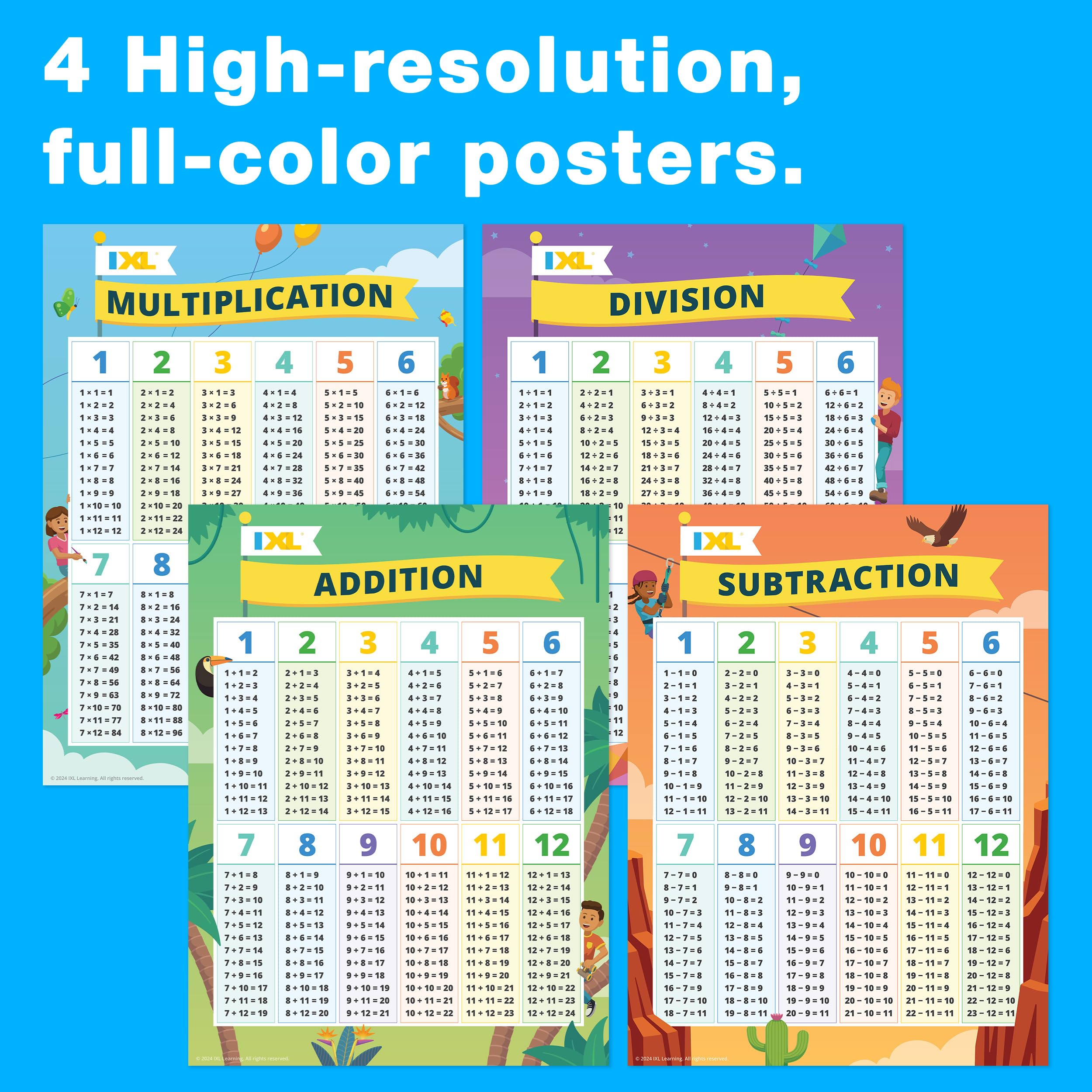 IXL 4 Pack of Math Posters, Multiplication, Division, Addition, and Subtraction Math Facts Classroom Posters, Elementary and Middle School Math Classroom Decor