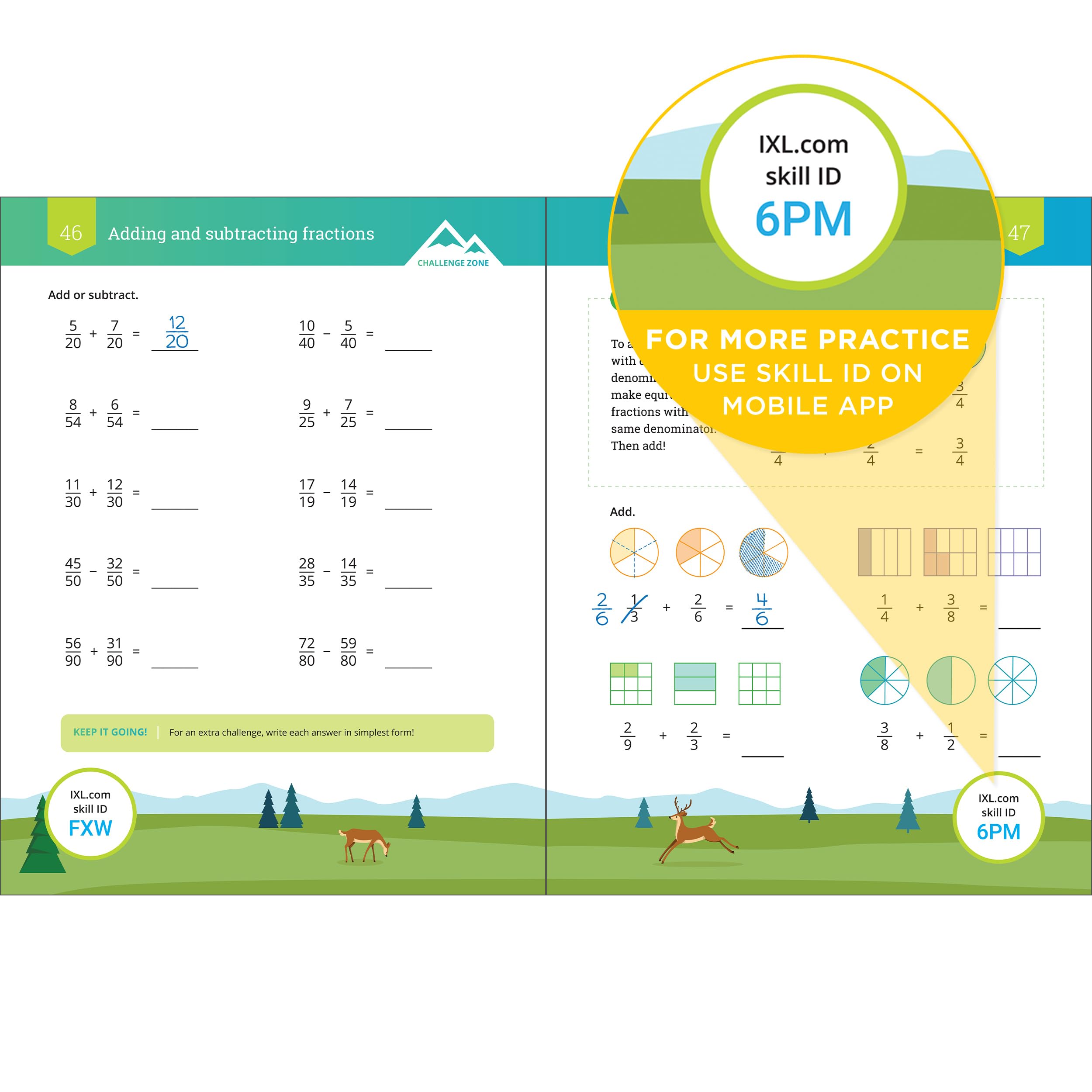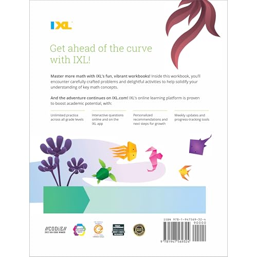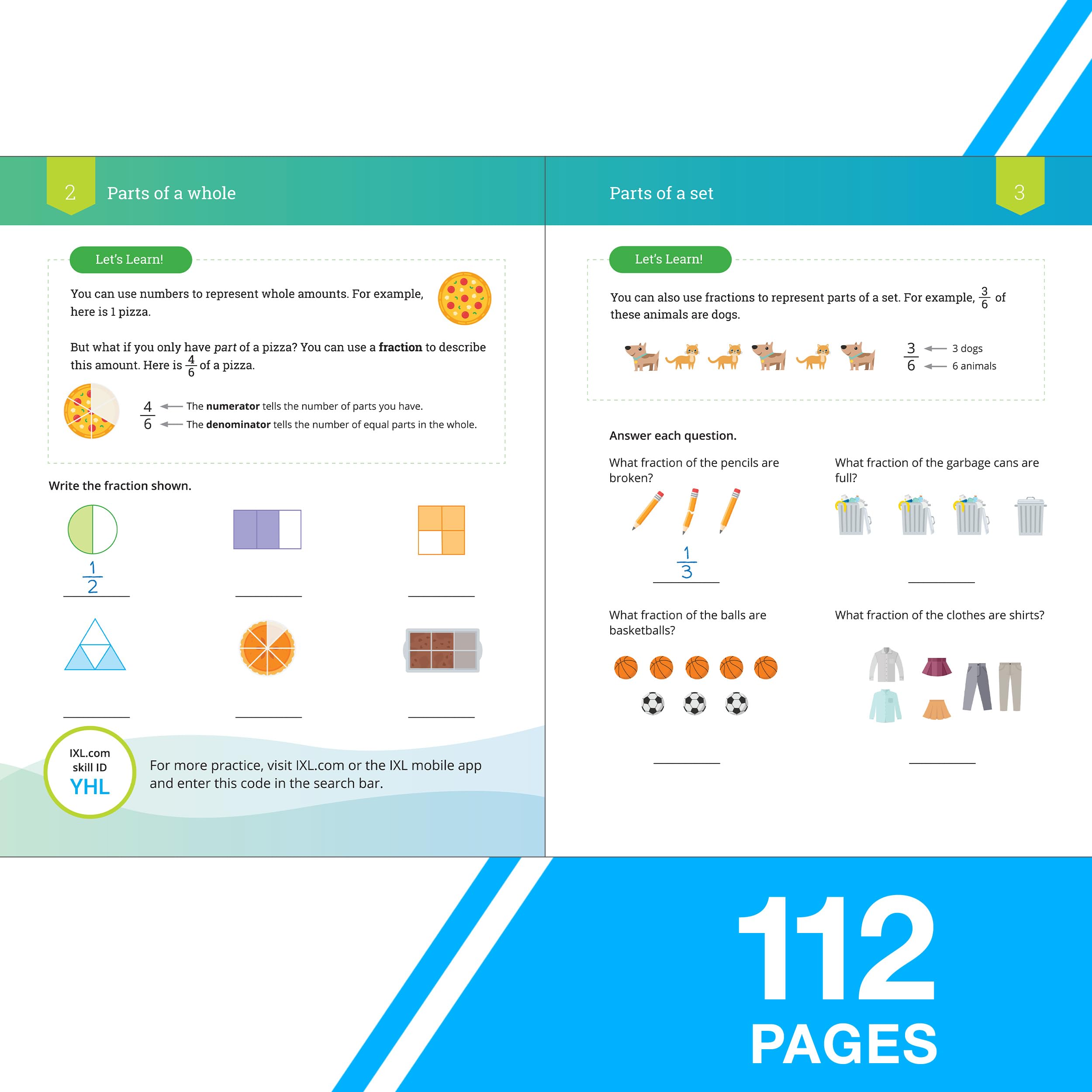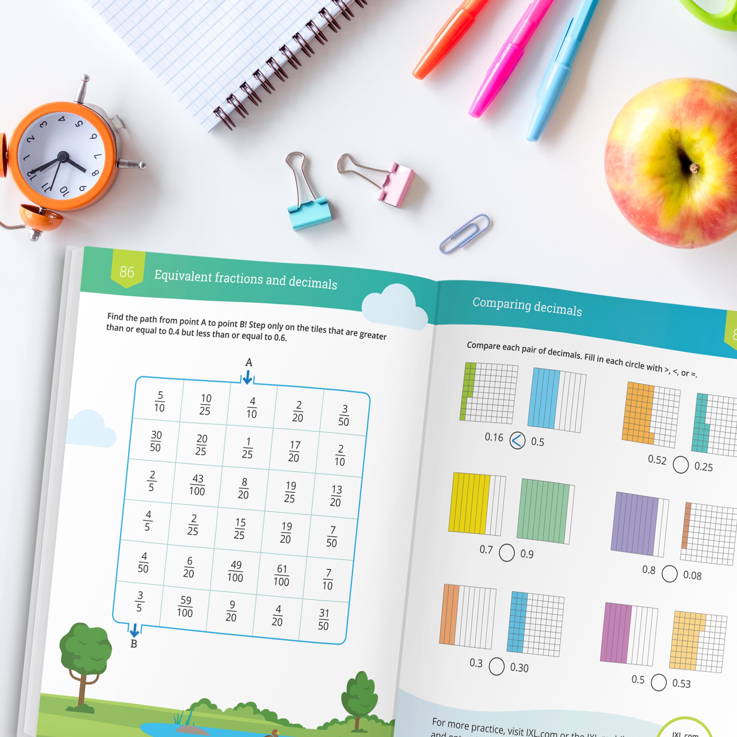 MUST-KNOW 4TH GRADE MATH SKILLS: Make your child fantastic at both fractions and decimals with IXL’s Fractions & Decimals Math Workbook! This 4th grade workbook opens up a wonderful world of learning for your child while guiding them through both must-know fractions skills and decimals skills for fourth graders. Build your child’s excitement for learning and give them the gift of confidence in math! DELIGHTFUL & FUN: Colorful pages bring math to life with thoughtfully crafted problems, vibrant illustrations, and a variety of delightful activities! PRACTICE ANYWHERE: These high-quality 4th grade math workbooks were created by mathematics experts so young learners can practice math wherever, whenever. Plus, connect your child to fun online practice by using your workbook with the IXL website or mobile app! Give your child the perfect blend of online and offline learning as you unlock extra questions, instant feedback, and even a growth plan tailored to them. WHY IXL: Trusted by over 1 million educators, and used in 96 of the top 100 school districts, IXL is proven to boost academic achievement. MATH BOOK CONTAINS: This is a 112-page 4th grade workbook, printed on 60 lb Text Smooth paper, and sized at 8.5 in x 10.875 in.