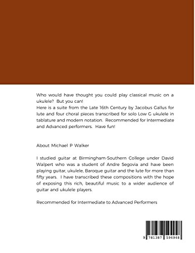 Who would have thought you could play classical music on a ukulele? But you can! Here is a suite from the Late 16th Century by Jacobus Gallus for lute and four choral pieces transcribed for solo Low G ukulele in tablature and modern notation. Recommended for Intermediate and Advanced performers. Have fun!