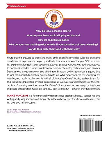 Over Two Million Janice VanCleave Books Sold! Janice VanCleave’s Science Around the Year Dozens of Seasonal Projects Loads of Fun Facts Why do leaves change colors? How do polar bears avoid slipping onthe ice? How are snowflakes made? Why do your toes and fingertipswrinkle if you spend lots of time swimming? How do flies tastetheir food with their feet? Figure out the answers to these andmany other scientific mysteries with this awesome assortment ofexperiments, projects, and facts for every season of the year. Withan amazing experiment for each week, Janice VanCleave’s ScienceAround the Year introduces you to dozens of wondrous topics inastronomy, biology, chemistry, earth science, and physics. Discoverwhy leaves turn colors and fall off trees in autumn, why Septemberis a good time to look for monarch butterflies, how salt melts ice,what pinecones can tell you about the weather, and much, much more.As with all of Janice VanCleave’s books, each activity is fun andincludes simple step-by-step instructions, as well as clearexplanations of the concepts you’re seeing in action. JaniceVanCleave’s Science Around the Year promises hours and hours offascinating, hands-on, safe, low-cost science fun-at home or in theclassroom.