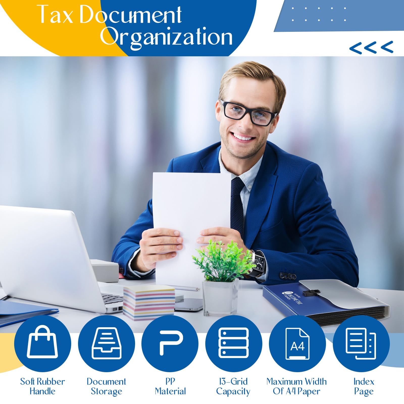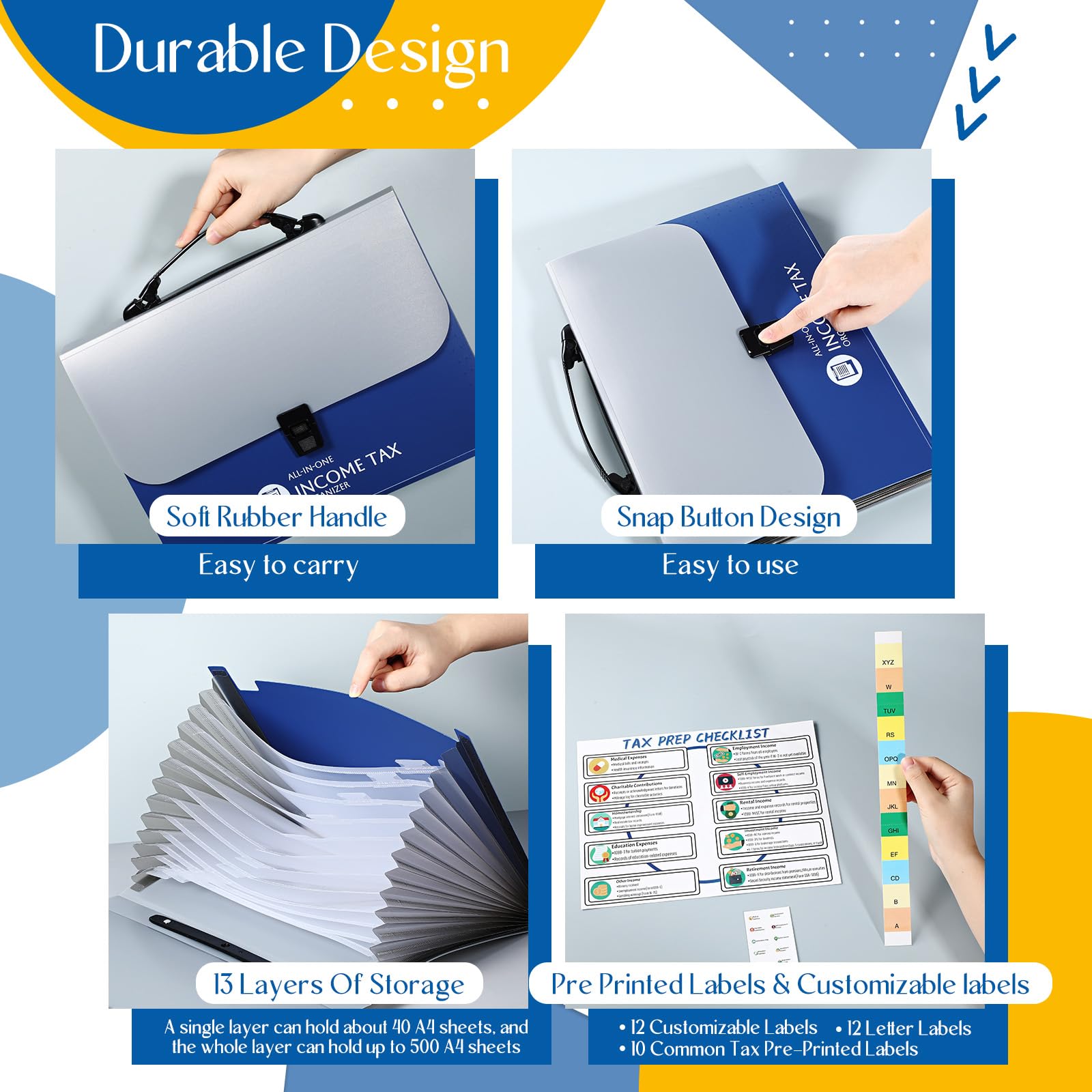 - Large capacity: This tax document organizer has 13 pockets, each holding about 40 sheets of paper, it can be flexibly expanded and shrunk as the number of files increases, holding a total of about 500 sheets of paper, ideal for organizing and protecting important documents, paperwork, bills, tax records, receipts, invoices and more