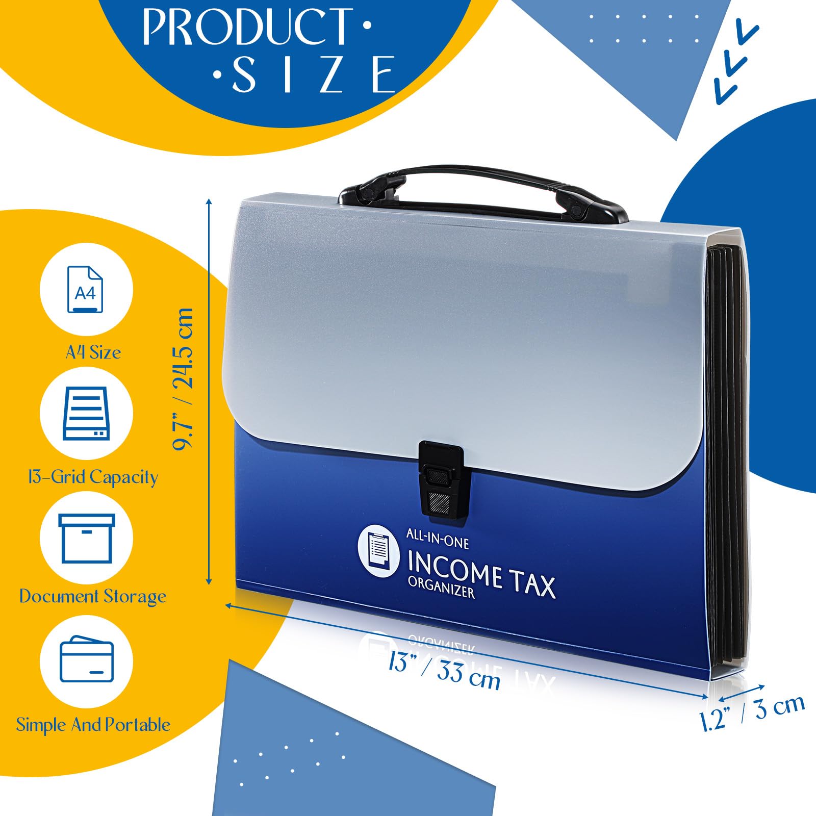 Features: The tax document storage measures approximately 13 x 9.65 x 1.18 inches. Thus, providing sufficient space to arrange and sort your documents without any clutter. The bills organizer features a secure button closure design for easy access to files. This ensures the security and safety of your important tax paperwork. Specifications: Material: plastic Color: blue Size: Tax folder: about 13 x 9.65 x 1.18 inches/ 33 x 24.5 x 3 cm List: about 8.5 x 10.98 inches/ 21.6 x 27.9 cm Tax sticker: about 0.79 x 0.39 inch/ 2 x 1 cm Package includes: 1 x Tax organizer 1 Sheet tax category pre printed label sticker 1 x Common tax category list 12 x Alphabet labels 12 x Customizable labels Notes: Manual measurement, please allow slight errors on size. The color may exist a slight difference due to different screen displays.