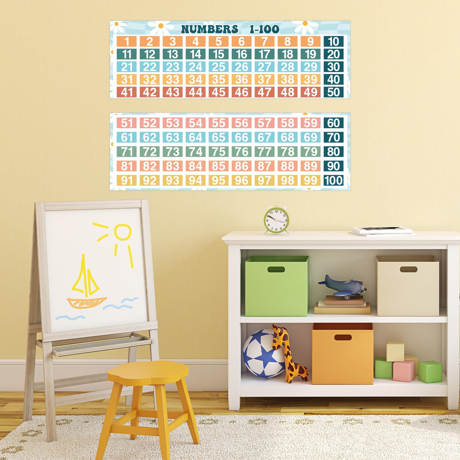 JarThenaAMCS 2Pcs Math Poster Chart Numbers 1-100 Classroom Decorations for Teacher Boho Floral Theme Number Line Bulletin Board Set for Elementary Middle School Wall Supplies
