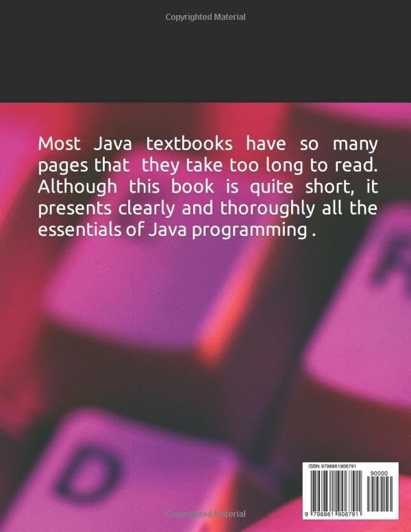 One of Woody Allen’s jokes goes like this: ” I took a speed reading class. I read War and Peace in ten minutes. I think it’s about Russia.” War and Peace has always been the undisputed exemplar of a book too long to read. Unfortunately, like War and Peace, most introductory Java textbooks are simply too long to read in a single semester course. In contrast, this book is quite short. Nevertheless, it covers everything students need to learn in a first course in computer science and programming. The book emphasizes program design, recursion, and simple linked structures–three topics that are absolutely essential prerequisites for the second course (typically called “data structures”). It also thoroughly explains the essential object-oriented features of Java. The free software package for the book contains slides for the entire book, an extra chapter on GUI programming and applets, all the Java programs that appear in the book, plenty of homework problems, sample exams (with answers), and instructions on using the JDK, text editors, and the command line.
