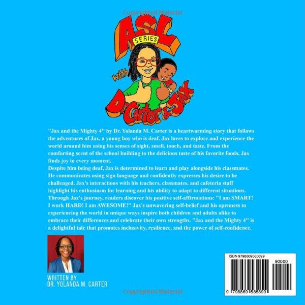 “Jax and the Mighty 4” by Dr. Yolanda M. Carter is a heartwarming story that follows the adventures of Jax, a young boy who is hearing impaired. Jax loves to explore and experience the world around him using his senses of sight, smell, touch, and taste. From the comforting scent of the school building to the delicious taste of his favorite foods, Jax finds joy in every moment. Despite his hearing impairment, Jax is determined to learn and play alongside his classmates. He communicates using sign language and confidently expresses his desire to be challenged. Jax’s interactions with his teachers, classmates, and cafeteria staff highlight his enthusiasm for learning and his ability to adapt to different situations. Through Jax’s journey, readers discover his positive self-affirmations: “I am SMART! I work HARD! I am AWESOME!” Jax’s unwavering self-belief and his openness to experiencing the world in unique ways inspire both children and adults alike to embrace their differences and celebrate their own strengths. Jax and the Mighty 4″ is a delightful tale that promotes inclusivity, resilience, and the power of self-confidence.
