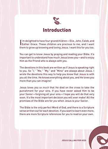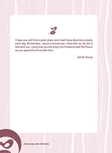 Deepen your child’s or tween’s relationship with Jesus and build their faith as they read 365 daily devotions written as if Jesus is speaking directly to their hearts. Adapted from Sarah Young’s bestselling book, this inspiring year-long devotional?has scripture and personal reflections that share Jesus’ message of peace, for today and every day. Jesus Calling: 365 Devotions?for Kids focuses on the biblical promise of peace, which can be experienced at any time and in all circumstances. With peace-filled reminders from the Word of God, these devotions will intimately and gently connect your children with Jesus, the One who meets them where they are. Written as if Jesus Himself is speaking directly to the reader,?this devotional?will engage your children and tweens and help them find lifelong encouragement in Him. In Jesus Calling: 365 Devotions for Kids,?your 6- to 12-year-old child will Feel comforted by words of hope and encouragement Be reassured of Jesus’ unending love for them Receive gentle guidance based on Scripture Read scripture verses that strengthen their faith Connect with Jesus further as they reflect and meditate on God’s Word With versions of Jesus Calling for adults and kids, families can explore God’s Word together as they discuss what they’ve read during their devotional times. With these much-loved devotions, children will spend time in the presence of the Savior and calm their minds and hearts with His love. Sarah Young has sold more than 40 million books worldwide. Some of her other children’s books include? Jesus Calling: My First Bible Storybook Jesus Calling: The Story of Easter Jesus Calling: The Story of Christmas Sarah Young’s children titles: Make a great Christmas, holiday, or baptism gift Supports kids and tweens as they grow into their faith Is a wonderful bible study, small group, or youth ministry resource