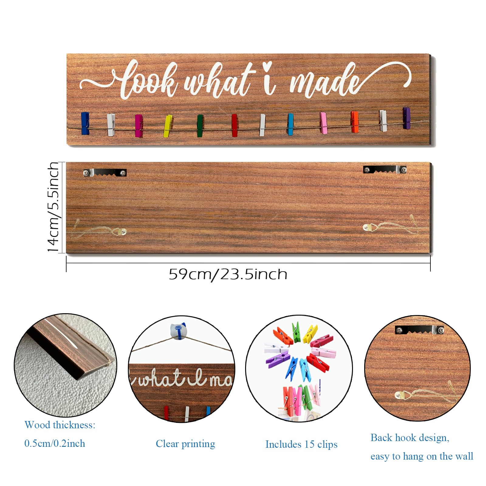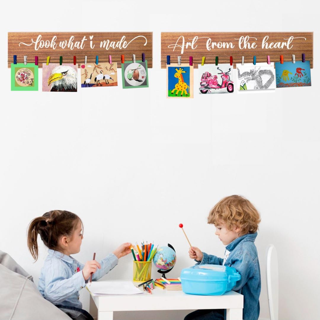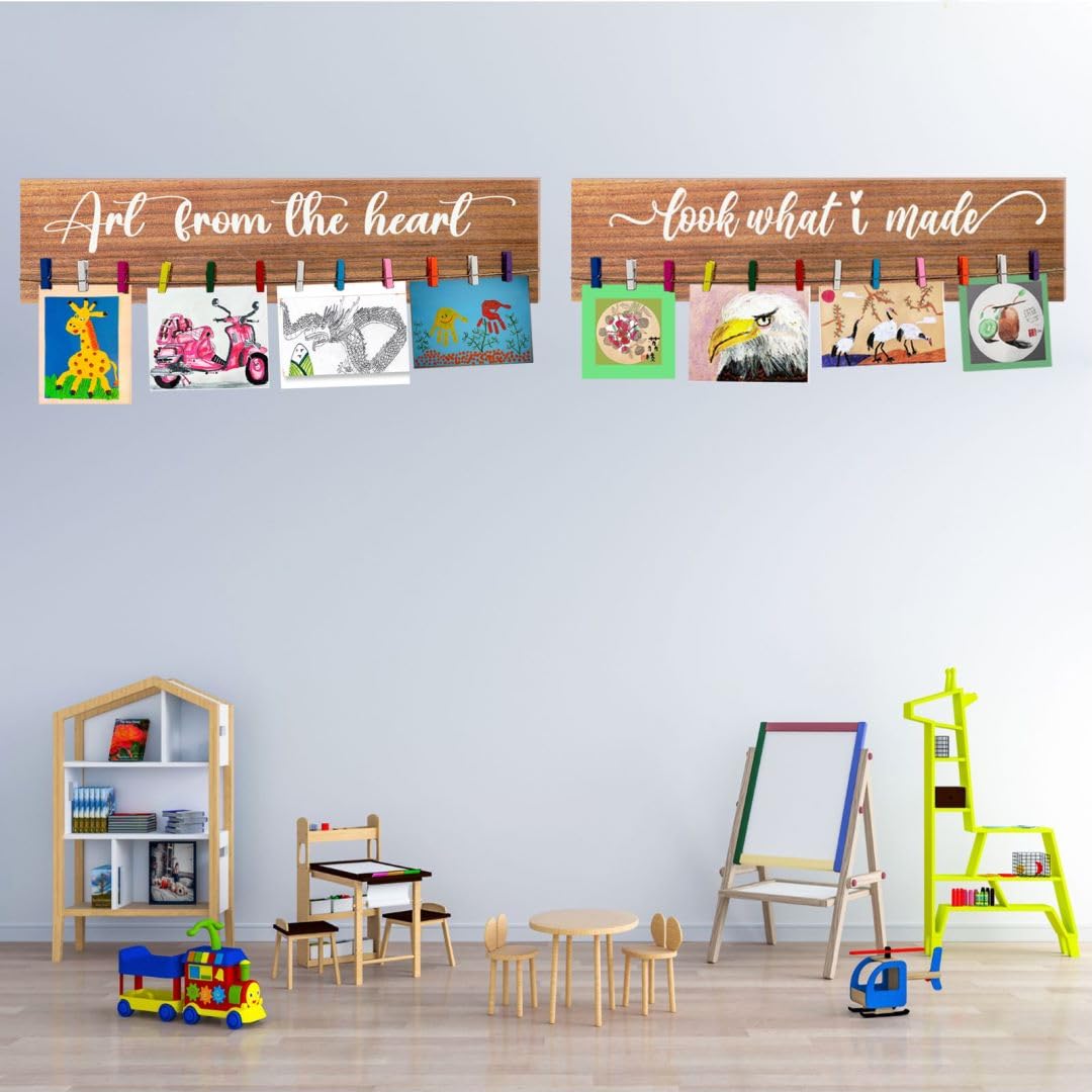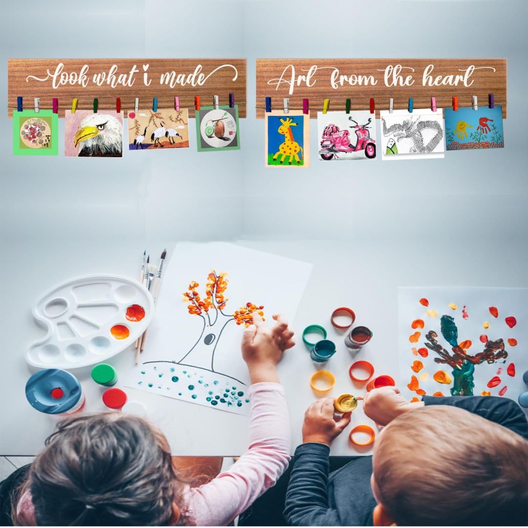 You will receive two wooden signs, each containing 15 colored clips that can be used to decorate children’s rooms and showcase their works. This is a perfect way for your child to display their art work when the fridge gets too full! Great addition to the play room, child’s bedroom, living room, or any room,a proud display in family spaces. It can also be a thoughtful present for parents, grandparents, or teachers who want to show their appreciation and support for a child’s artistic endeavors. Important: Please keep in mind when ordering that Wood is a natural material and not all wood has an identical base color, so each batch may vary in color from the display color.It will have small imperfections from time to time.Wood knots,texture,indentations, and small blemishes are possible. We will always do our best to ensure every piece of wood is quality and provide you with good pre-sales and after-sales service.