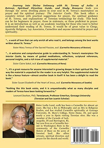 Journey into Divine Intimacy with St. Teresa of Avila: A Retreat, Spiritual Direction Guide and Study Resource is a guide through the various levels of the human person to the deepest center of the soul where God abides. It is based on St. Teresa of Avila’s masterpiece on prayer and the spiritual journey to God: The Interior Castle. This book is also offered as a Retreat with practical suggestions for prayer, along with the wisdom of St. Teresa’s spiritual direction guidance for growth in passive supernatural prayer. St. Teresa is a Doctor of the Catholic Church in mystical theology, and her teaching on prayer is comprehensive and sophisticated and cannot be immediately grasped without some guidance. Thus, the book also covers the underpinning pedagogical explanations of her terminology with extensive Supplemental Material. This book covers each of the seven dwelling places of the soul and includes a Description of the Dwelling Place and Teresian Teachings for Prayer and Life pertinent to each dwelling place. The first section is followed by a second that is directed more towards a retreat and the spiritual activity of praying and includes: Internalizing the Teachings, a Reflection, Reflection Questions, Guidance for Prayer and Prayer Period with Scripture Passages that suit that inner dwelling. There is also a Guided Meditation based on Teresian images that can be used for prayer associated with that particular dwelling. At the end of each of the dwelling places is a short biographical piece on St. Teresa that relates to her own stage of life and prayer within a particular dwelling place. The book comes with introductory material that describes how to get the most out of the book: How to Use this Book, How to Use this Book for Prayer and How to Use this Book for a Retreat. It also includes useful visual illustrations of the material in diagrams and charts that summarize important material. This book is meant to be a good balance of Teresian prayer-theory and inspirational Teresian mentoring for the practice of prayer and growth in contemplative prayer and Christian life. The audience for this book is comprehensive. It can be a directed retreat or a self-guided retreat, as well as counseling for personal spiritual guidance, or a manual for spiritual directors. It can be for beginners in prayer, those in a stalemate in their prayer life, or those proficient in prayer. It can be an introduction as well as a good basic academic teaching for those who want to better understand their reading of St. Teresa’s Interior Castle. It would be of great value to Clergy, Apostolic Religious, Contemplatives, Lay Associates, Carmelites and anyone in initial religious formation. Prayer groups, religious educators, and any Christian seeking a deeper prayer life can be enriched by St. Teresa’s teachings.
