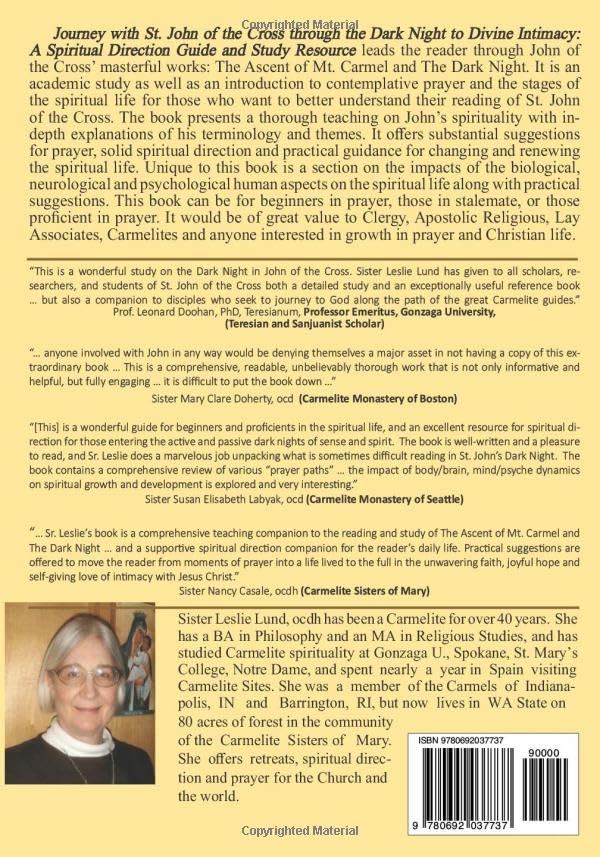 Journey with St. John of the Cross through the Dark Night to Divine Intimacy: A Spiritual Direction Guide and Study Resource leads the reader through St. John of the Cross’ masterpieces: The Ascent of Mt. Carmel and The Dark Night–a spiritual journey through the dark nights of faith, hope and love to intimacy and transformation in God. John of the Cross is a Doctor of the Catholic Church in mystical theology, and his teachings are profound but not always immediately grasped without some guidance. This book gives clear and thorough explanations of John’s theology and technical theological language. The book is meant to be a good balance of St. John’s pedagogical material and teachings on prayer and the stages of the spiritual life, as well as inspirational mentoring for the practice of prayer–especially supernatural contemplative prayer. Thus, it includes a comprehensive section of practical suggestions for prayer, as well as an extensive section on John’s wise spiritual direction guidance for each of the dark nights. In addition to explaining John’s mystical theology and terminology, the book includes useful diagrams and charts that summarize important material and includes an extra section of Supplemental Material with a Glossary of Terms, and another containing a description of the Mystical Favors that John describes in his works. A unique feature of this book is a section on the biological, neurological and psychological human elements that have an impact on the spiritual aspects of Christian living, with practical suggestions for moving forward in the spiritual life, and helpful resources in Appendices 1 and 2. This book is a guide for personal spiritual growth, and a reference for spiritual directors. It can be helpful for beginners in prayer, those in stalemate in their prayer life, or those proficient in prayer. It would be of value to Clergy, Apostolic Religious, Lay Associates, Carmelites, and for those in initial religious formation. The audience for this book can be anyone with an interest in growing in prayer and knowing St. John’s profound mystical theology. Prayer groups, religious educators, and anyone seeking a deeper prayer life, or who find themselves in a bewildering or frightening Dark Night will find support, gain new insights and be enriched from St. John’s personal experience and teachings on the Dark Night of the soul.