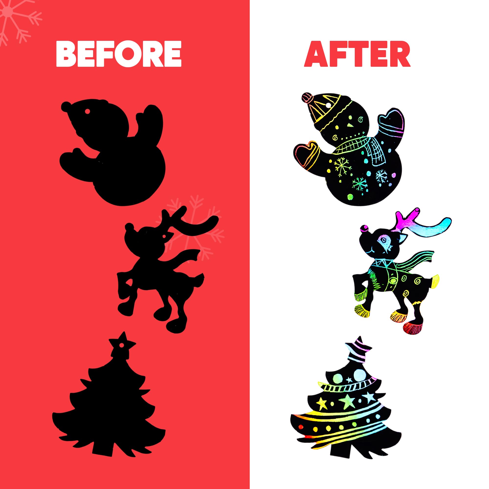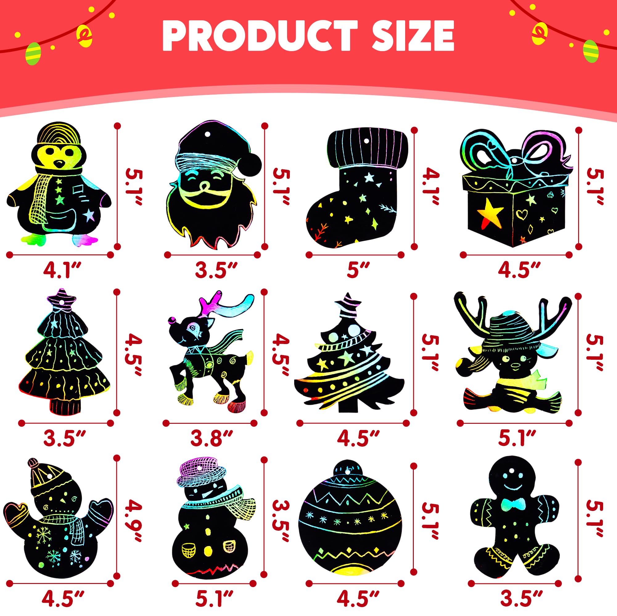 Super valuable Christmas craft kits include 72 scratch paper(8 pcs for 9 patterns), 72 red cords, and 24 drawing sticks.