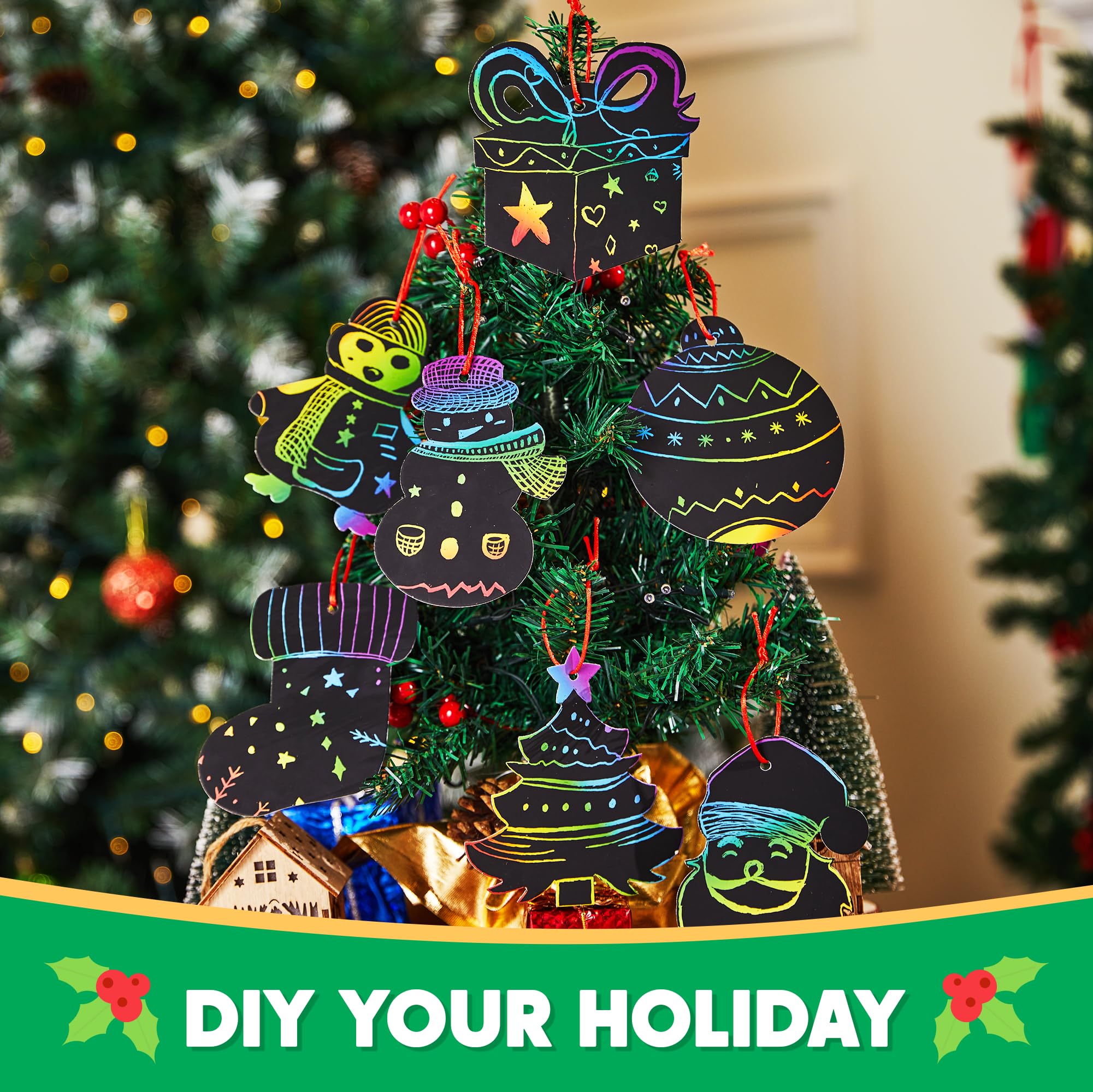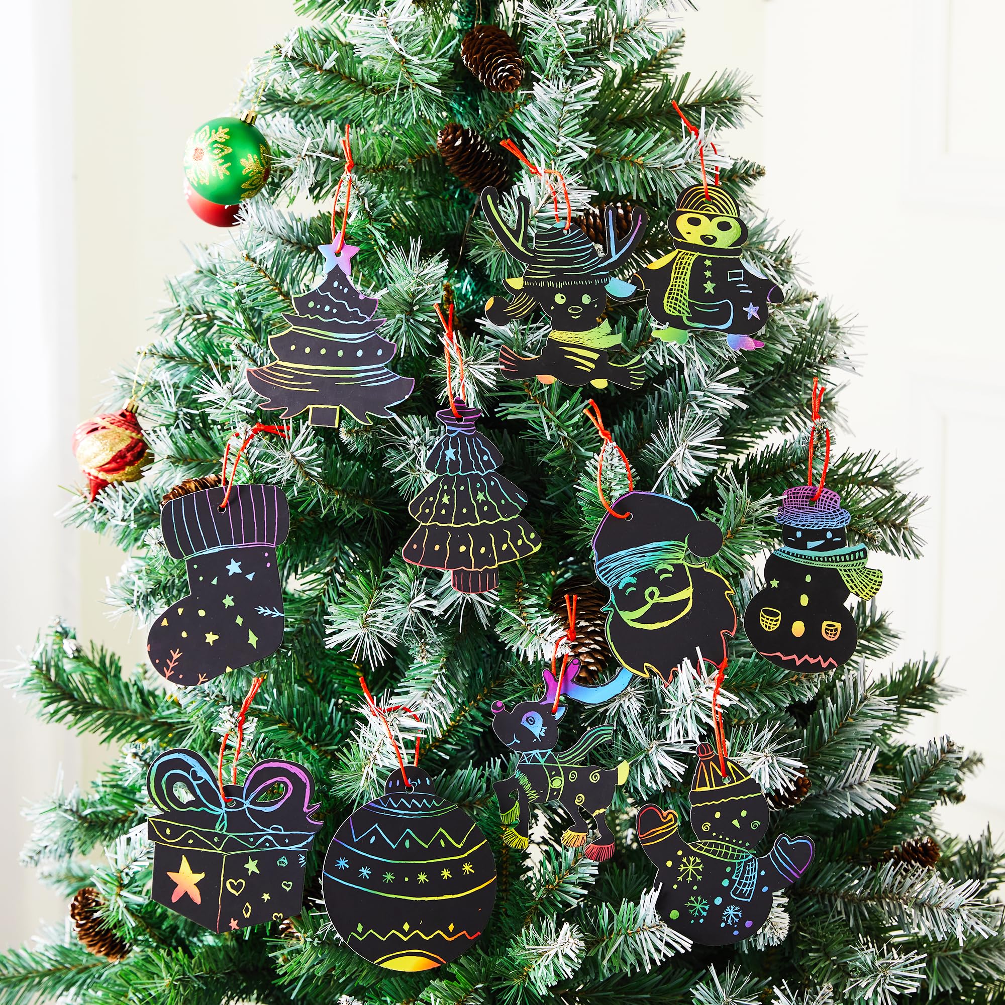 JOYIN 72 Pcs Christmas Scratch Art Ornaments, Rainbow Color Scratch Paper Craft Kit Include Snowman, Christmas Tree, and Reindeer, Scratch Off Hanging Ornament for Kids Party Favor