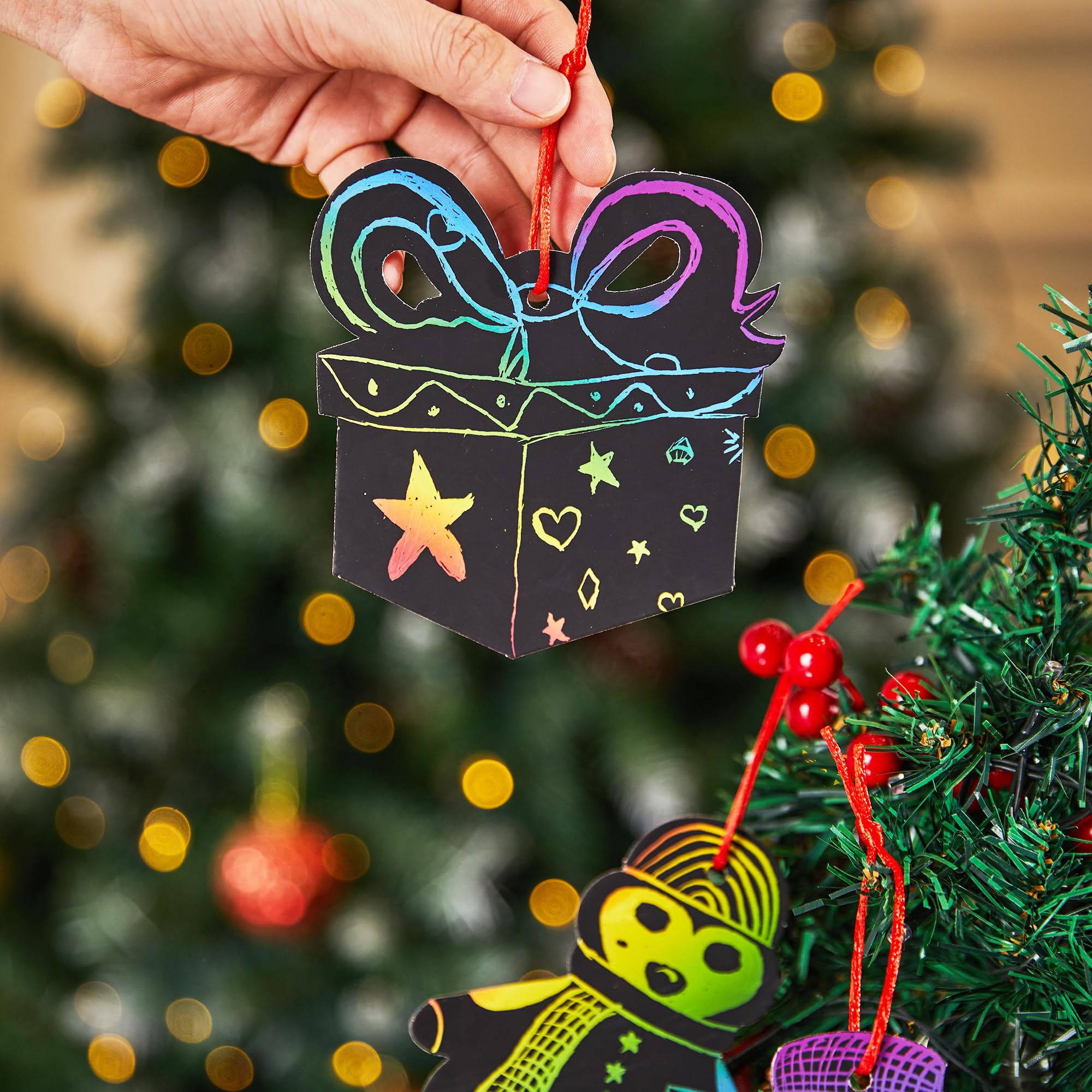Scratch to add rainbow color details to your ornaments and hang them on your Christmas tree with red cords