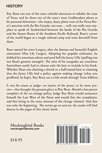Roy Bean was one of the most colorful characters to inhabit the state of Texas, and he chose one of the state’s most Godforsaken places as his personal dominion–the empty, dusty plains west of the Pecos River’s junction with the Rio Grande, out near… well, not really near anyplace to speak of. Sandwiched between the banks of the Rio Grande and the Sunset Route of the Southern Pacific Railroad, Bean’s corner of the world began as a rough railroad camp and went downhill from there. Bean named his town Langtry, after the famous and beautiful English entertainer Miss Lily Langtry. Adopting her popular nickname, he dubbed his notorious saloon and pool hall the Jersey Lilly (spelling was not Bean’s greatest strength). The tales of his escapades are countless; Sonnichsen surely had to choose only the best to include in his book. Whether Bean was chaining a drunk to a half-tamed bear or claiming that the Jersey Lilly had a policy against making change (what you proffered, he kept), Roy Bean cut a wide swath through Texas folklore.It was his status as judge–or justice of the peace, to be more precise–that brought the greatest glory to Roy Bean. Should a bar patron complain of the no-change policy, Judge Roy Bean would announce himself the Law West of the Pecos and would fine the complainer, said fine being in the exact amount of the change claimed. And that was only the beginning. The stories go on and on; the reader will find dozens in the pages of this classic book.
