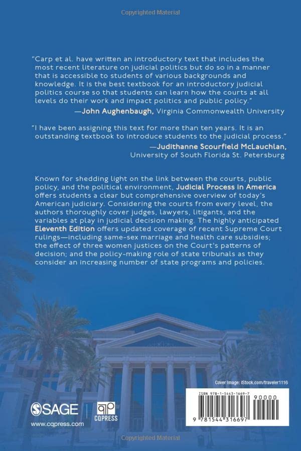 Judicial Process in America, Thirteenth Edition, by Robert Carp, Kenneth Manning, Lisa Holmes, and Jennifer Bowie is a market-leading and comprehensive textbook for both academic and general audiences. The book explains the link between the courts, public policy, and the political environment. Considering the courts from every level, the authors cover judges, lawyers, litigants, and the variables at play in the judicial decision-making process, the impact of those decisions on American citizens, and what the consequences are for the United States today.