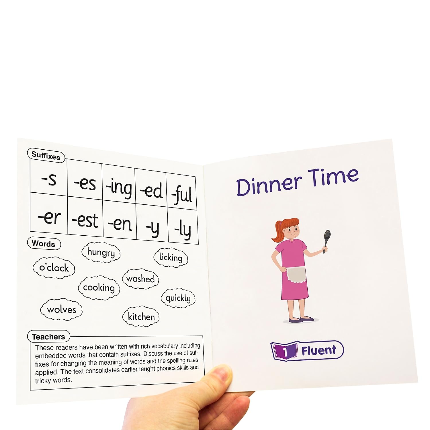 Spelling readers have been written with a rich vocabulary including embedded words that contain suffixes. They also consolidate earlier taught phonics skills and ‘tricky words’. Set includes 12 fiction readers, each with colorful illustrations. Book bank – Fluency 2 (Turquoise) Guided reading level: H-I Reading Level 16