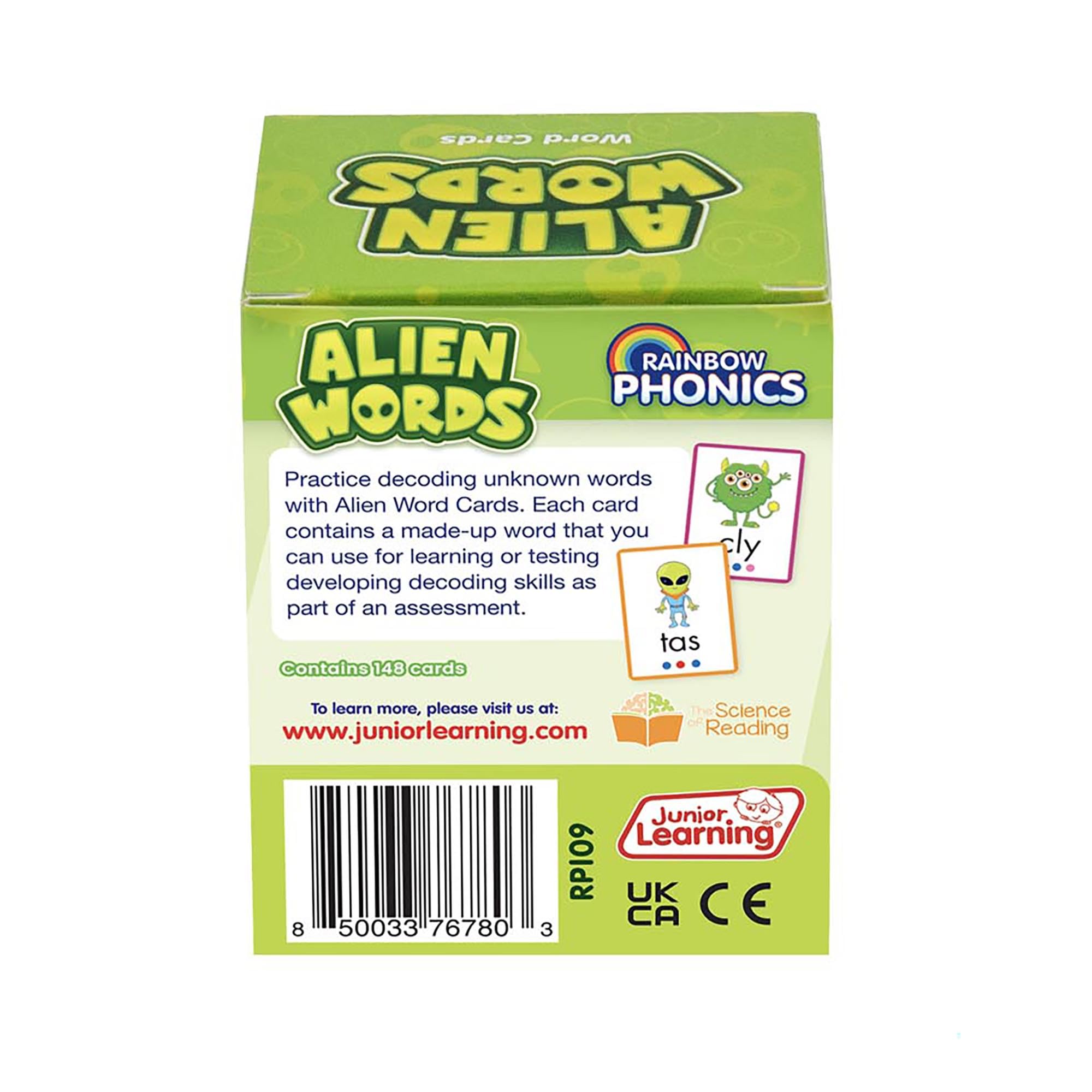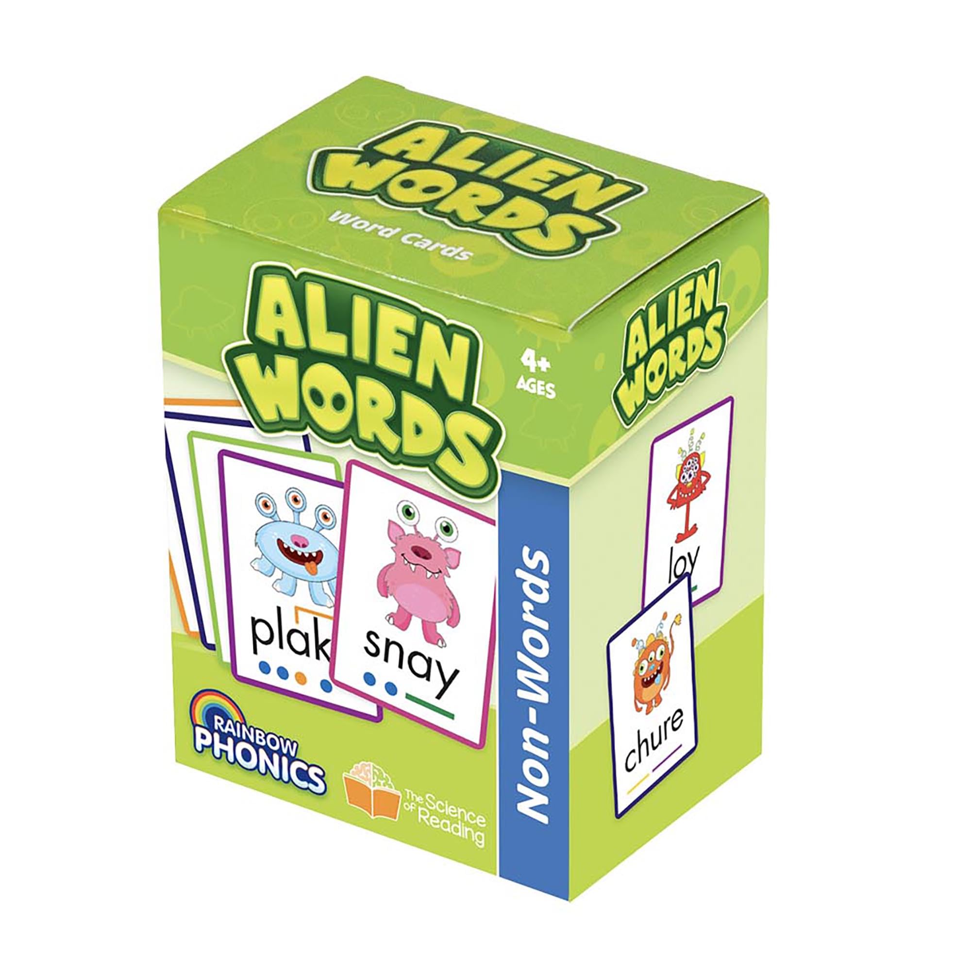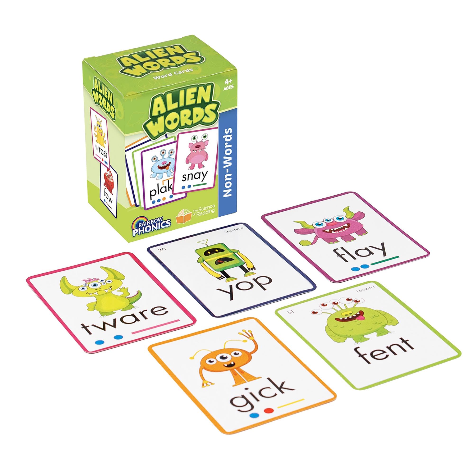 - ALIEN WORDS: Follow’s the Rainbow Phonics Progression. Cards present made up words to help teach kids sounds vs word association. Includes 148 cards.
