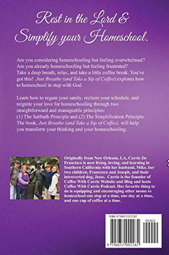 Homeschool simply and enjoyably! Are you considering homeschooling but are overwhelmed? Are you already homeschooling but feeling frustrated? Then just breathe… Take a deep breath, relax, and take a little coffee break! You’ve got this! Just Breathe (and Take a Sip of Coffee) explores how to homeschool simply and enjoyably. Learn how to change your mindset from home “schooling” to home education. Regain your sanity, reclaim your schedule, and reignite your love for homeschooling by simplifying your home and homeschooling and by using Sabbath Schooling. Just Breathe helps you live out your ministry of motherhood and your calling to homeschool. Don’t let fear and doubt steal your time, your freedom, your flexibility, or your joy. Just Breathe (and Take a Sip of Coffee) will help you transform your thinking. So grab your favorite cup of joe, get comfy, (sneak into the bathroom if needed to get a little peace and quiet), and learn how to rest in the Lord and simplify your homeschooling.