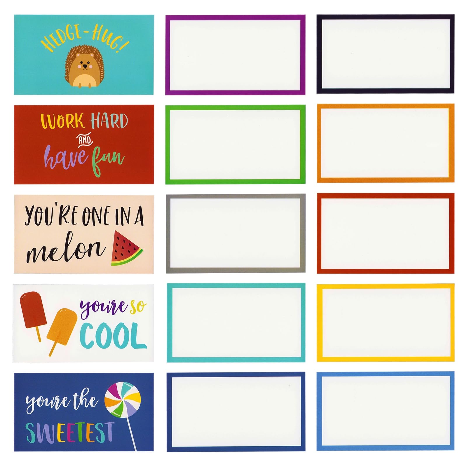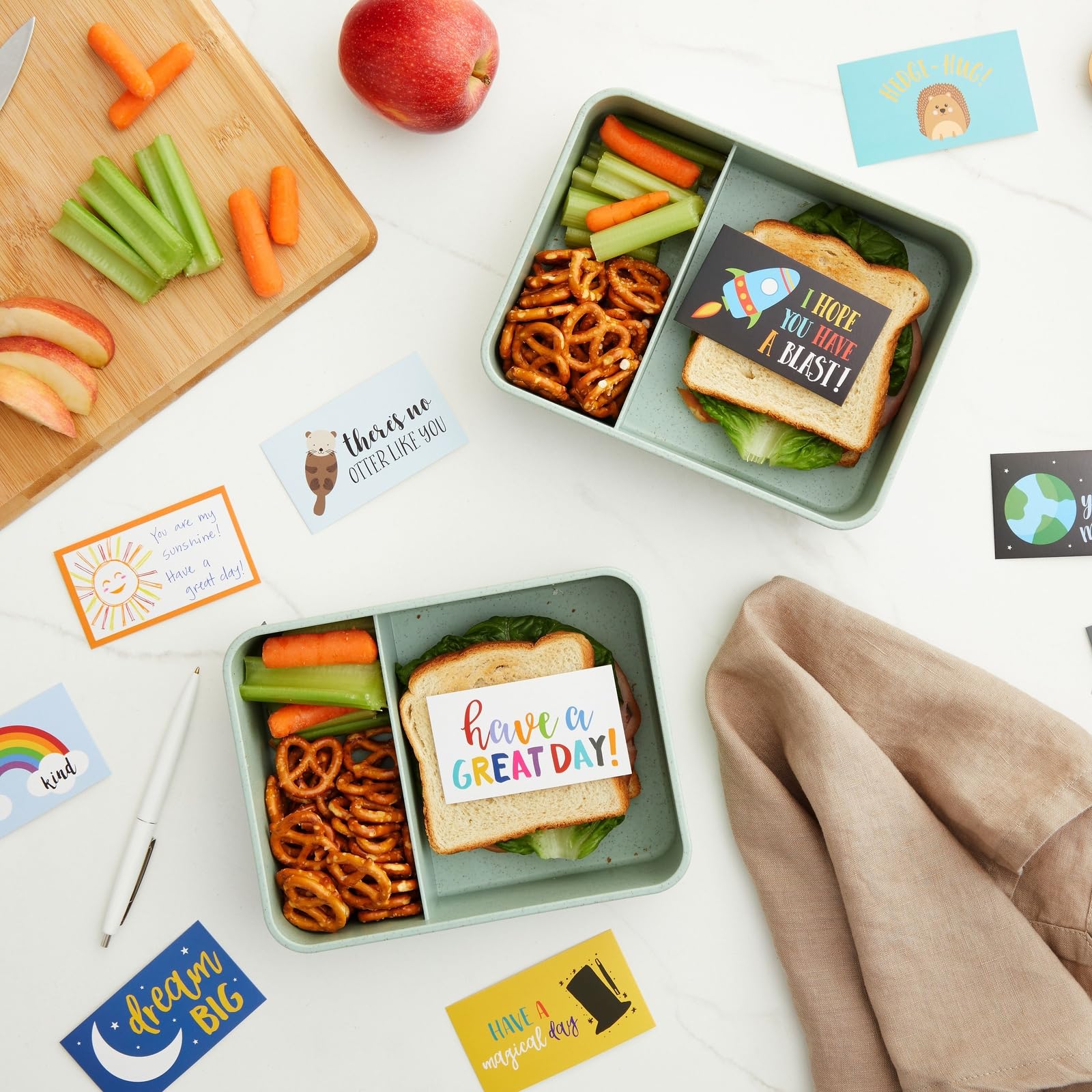 • Lunchbox Note Cards: Our single-side school lunchbox notes for kids come in 30 different designs, 2 of each design; some have inspirational messages, others are blank for you to fill in