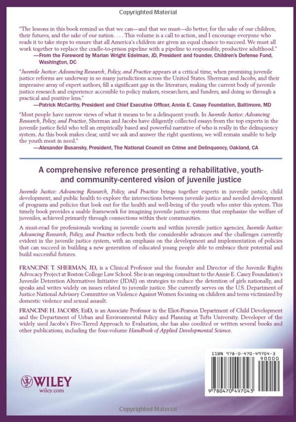 “The lessons in this book remind us that we canand that we mustdo better, for the sake of our children, their futures, and the sake of our nation. . . . This volume is a call to action, and I encourage everyone who reads it to take steps to ensure that all America’s children are given an equal chance to succeed. We must all work together to replace the cradle-to-prison pipeline with a pipeline to responsible, productive adulthood.” From the Foreword by Marian Wright Edelman, JD, President and founder, Children’s Defense Fund, Washington, DC “Juvenile Justice: Advancing Research, Policy, and Practice appears at a critical time, when promising juvenile justice reforms are underway in so many jurisdictions across the United States. Sherman and Jacobs, and their impressive array of expert authors, fill a significant gap in the literature, making the current body of juvenile justice research and experience accessible to policy makers, researchers, and funders, and doing so through a practical and positive lens.” Patrick McCarthy, President and Chief Executive Officer, Annie E. Casey Foundation, Baltimore, MD “Most people have narrow views of what it means to be a delinquent youth. In Juvenile Justice: Advancing Research, Policy, and Practice, Sherman and Jacobs have diligently collected essays from the top experts in the juvenile justice field who tell an empirically based and powerful narrative of who is really in the delinquency system. As this book makes clear, until we ask and answer the right questions, we will remain unable to help the youth most in need.” Alexander Busansky, President, The National Council on Crime and Delinquency, Oakland, CA A comprehensive reference presenting a rehabilitative, youth- and community-centered vision of juvenile justice Juvenile Justice: Advancing Research, Policy, and Practice brings together experts in juvenile justice, child development, and public health to explore the intersections between juvenile justice and needed development of programs and policies that look out for the health and well-being of the youth who enter this system. This timely book provides a usable framework for imagining juvenile justice systems that emphasize the welfare of juveniles, achieved primarily through connections within their communities. A must-read for professionals working in juvenile courts and within juvenile justice agencies, Juvenile Justice: Advancing Research, Policy, and Practice reflects both the considerable advances and the challenges currently evident in the juvenile justice system, with an emphasis on the development and implementation of policies that can succeed in building a new generation of educated young people able to embrace their potential and build successful futures.