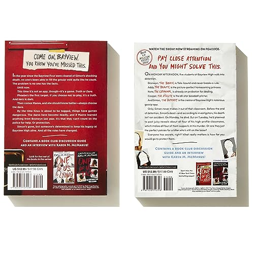 From the undisputed queen of thrillers comes a boxed set that includes the two bestselling thrillers in young adult fiction, One of Us Is Lying and its sequel, One of Us Is Next. “When it comes to YA suspense, Karen M. McManus is in a league of her own.” –Entertainment Weekly Pay close attention and you might solve this. One of Us Is Lying Five students walk into detention, and only four walk out. According to investigators, the last student’s death wasn’t an accident. He was planning to post juicy reveals about all four of his classmates the next day, which makes each of them a suspect. Or are they the perfect patsies for a killer who’s still on the loose? One of Us Is Next A ton of copycat gossip apps have popped up since Simon died, but no one’s been able to fill the gossip void quite like he could. The problem is that no one has had the facts. Until now. This time it’s not an app, though–it’s a game. Truth or Dare. And if you’re smart, you’ll always take the dare.